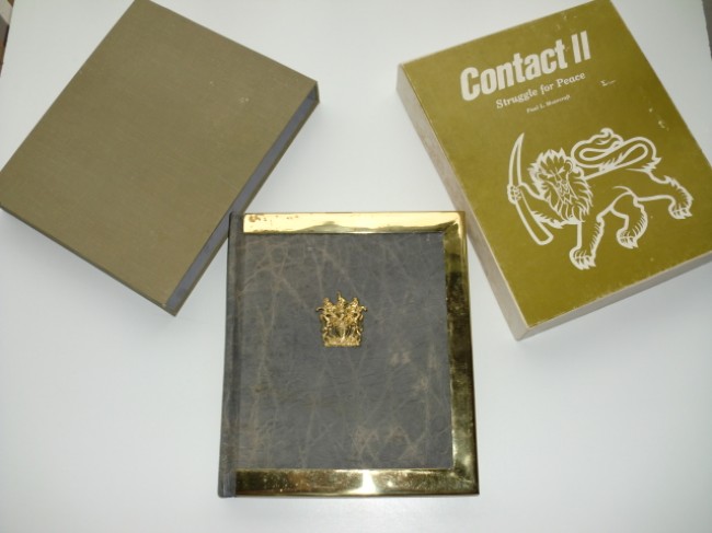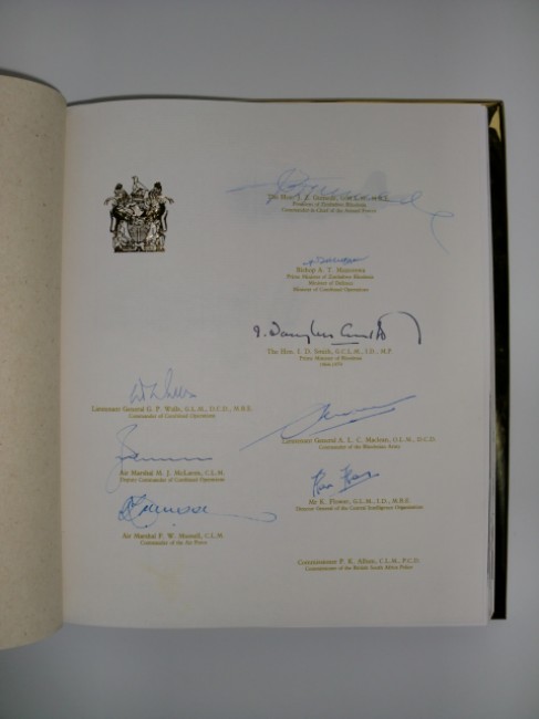 An excellent copy of the scarce limited, numbered edition, and signed by eight dignitaries, including Ian Smith and General Walls; this copy being #13/100, in cloth slip-case and pictorial box, bound in elephant hide with brass edging and Rhodesian coat-of-arms on the front cover, and spine title comprising a brass plate.