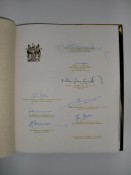Condition: the brass surround has a few small areas of tarnishing, otherwise bright, with the elephant hide being somewhat faded. The contents are in near-fine condition, with a small patch of light foxing to the front paste-down. The signature page has eight of nine signatures, Commissioner P.K.Allum's absent due to 'the changed political circumstances in 1980' as stated on the loosely inserted sheet signed by Moorcraft. The cloth slip-case is in excellent condition, and the box enclosing it is marked and rubbed, with one corner bumped, causing a little split. All in all, a superb example of this scarce historical document.