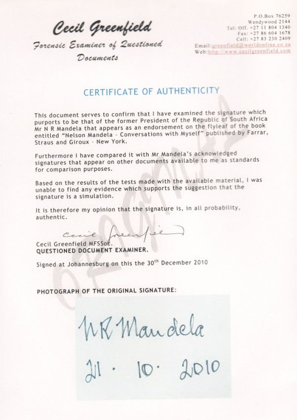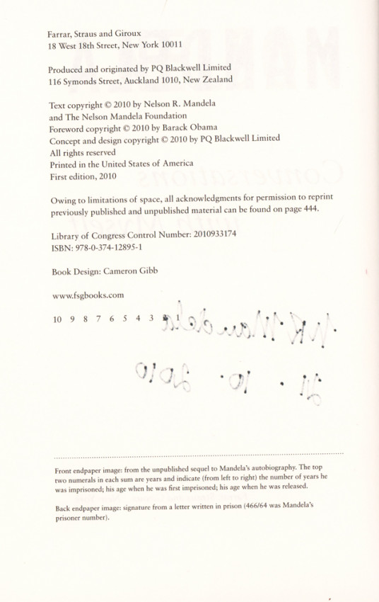Signed by Mandela on the title page and dated 21.10.2010.