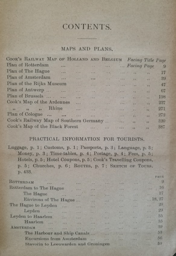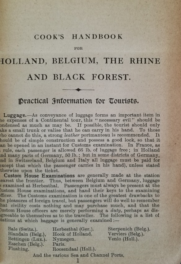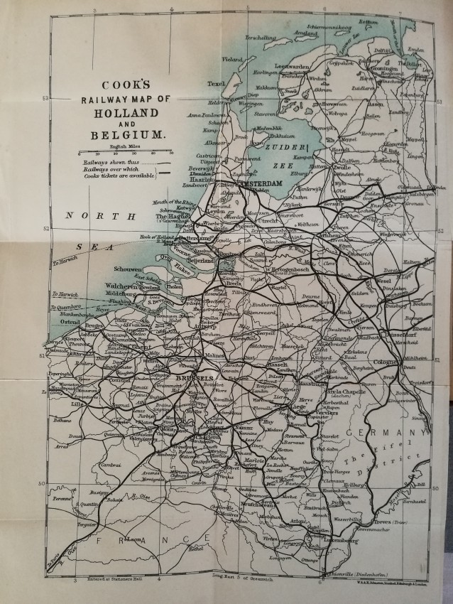 Full-bound in flexible maroon morocco with rounded corners, gilt lettering to the upper board and spine, all edges gilt, advertisements on endpapers + [2] pp of advertisements + 6-fold railway map as frontispiece, title-page and vii other pp of prelims + 460 pp of text and index + [4] blank pp for memoranda + 50 pp of advertisements, including for Cook's, railways, shipping lines and hotels.