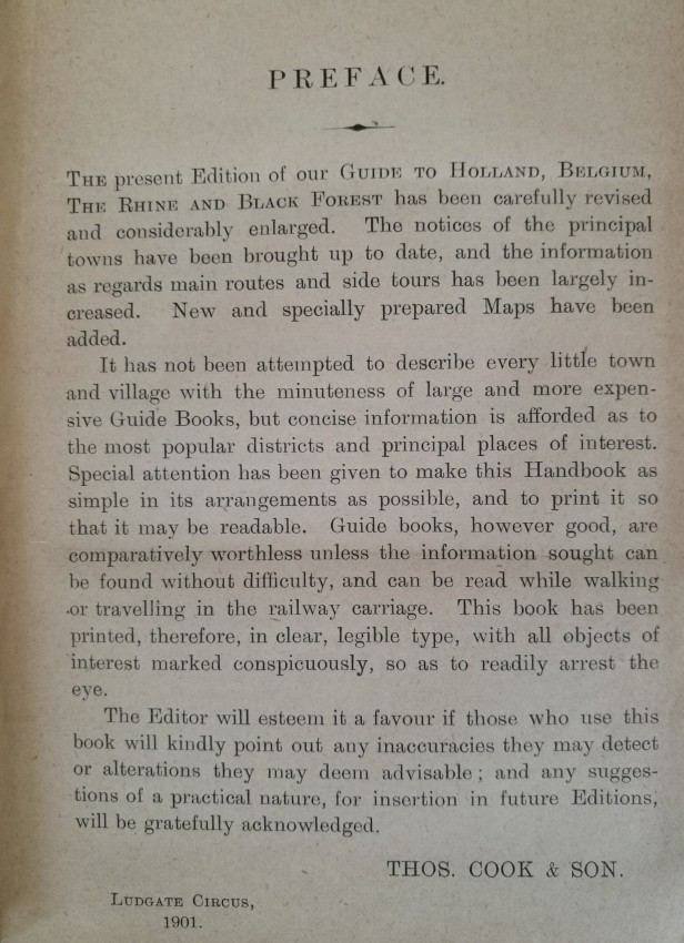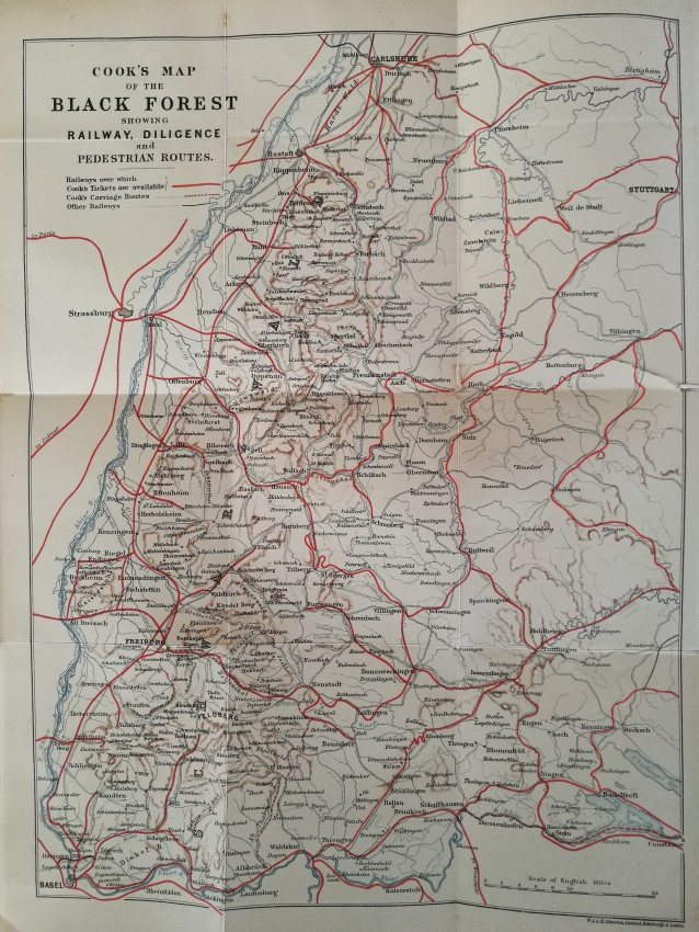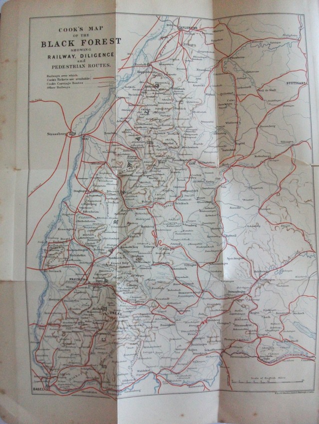 CONDITION. This copy is remarkably good, considering that it was used and dates back to 10 years before the sinking of the Titanic. The boards are only very lightly edge-rubbed. The gilding is well preserved, both on the upper panel and spine and on the page-edges. The binding has softened slightly. The endpapers and versos, as well as the title-page and the first 6 leaves and the first map are sunned. Light front and back binding cracks have been repaired. For the rest, the contents are complete - including fascinating maps of the Black Forest and the Rhine, and the plans - unmarked except for a pencil mark on one or two of the hotel advertisements, and otherwise undiscoloured.