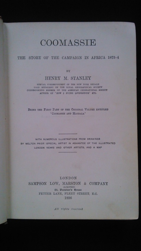 Being the first part of the original volume entitled ‘Coomassie and Magdala’, with numerous illustrations from drawings by Melton Prior (special artist in Ashantee of the Illustrated London News) and other artists, also has a map of the route of expedition to Coomassie.