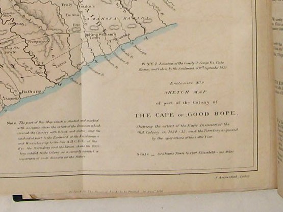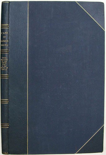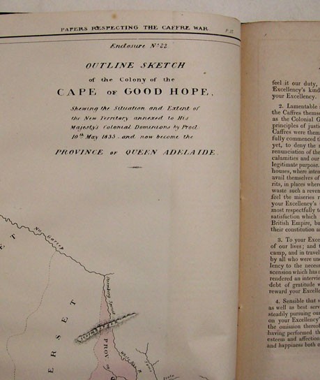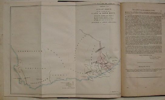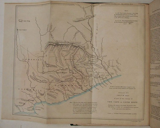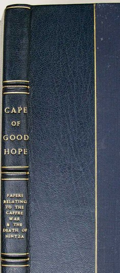 Later dark blue leather and book cloth binding by Aquarius of London, with gilt titling and gilt decorated raised bands on the spine. New end papers. There is a blank leaf bound between pages 52 and 53. Original 124 pages, fold out map of Queen Adelaide Province between pages 56 and 57, the second fold out map showing the extent of the invasion between pages 104 and 105, black and white in-text illustrations on pages 107 and 108.