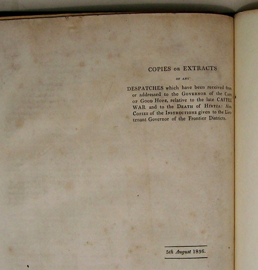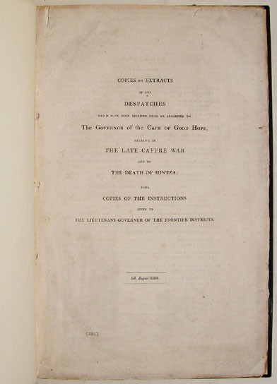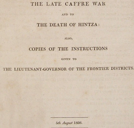 This scarce and important document deals with a turning point in South African history, with the Xhosa referring to this Frontier War as "Hintza's War" and in the climate of a loss of faith in British rule this war is also regarded as a principal cause of the Boer Great Trek.