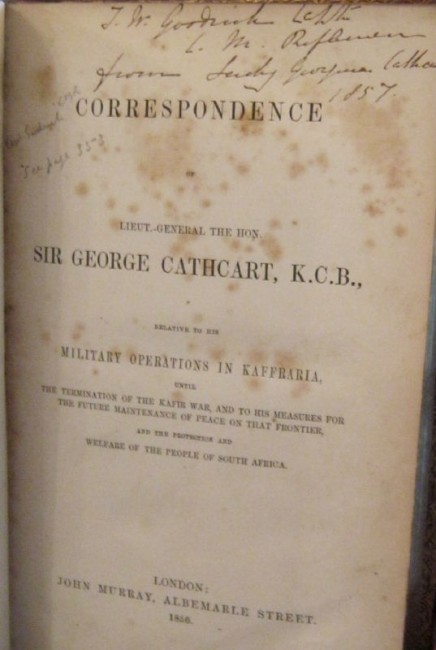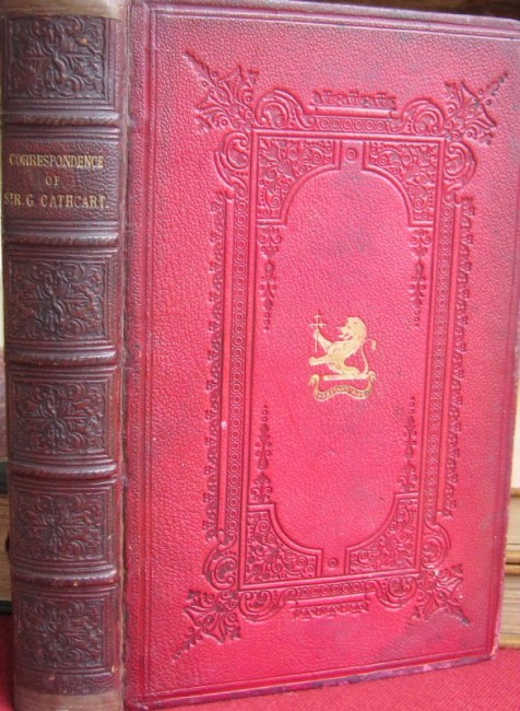 Cathcart was appointed Governor of the Cape and took over command of the army from Sir Harry Smith in 1852 and fought in the war against Sandile on the eastern Cape frontier & subsequently against Moshesh in Basutoland & eastern Free State. He gives full details of military action & there are some excellent maps. Inscribed on the title-page to [CAPT.] T.W. GOODRICH, C[APE] M[OUNTED] RIFLEMAN from LADY GEORGINA CATHCART, 1857. Goodrich is mentioned on page 353 of the text. George Cathcart was killed in the Crimea in 1854 and this book was inscribed by his wife to one of his companions on the eastern frontier of the Cape. Contemporary full crimson morocco, gilt emblem on front cover, all edges gilt. Pp. xiv,401, 7 maps (2 colour, 5 folding). MENDELSSOHN, 1/310; HOSKEN, p. 44. The book has been neatly recased, with spine restored at head & foot, hinges restored internally, spine darkened, book-plates of E.A. Maund & Maurice Green on front end-paper & paste-down, some foxing. An attractive copy.