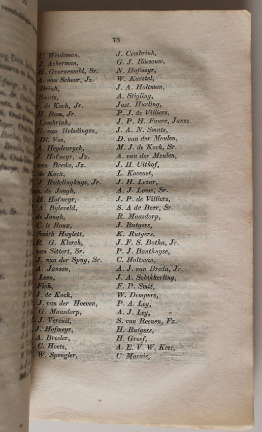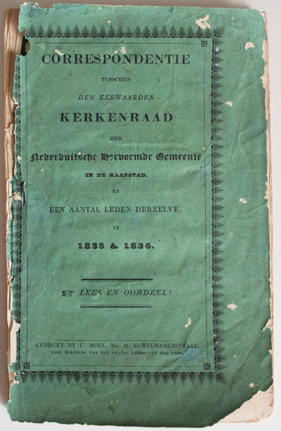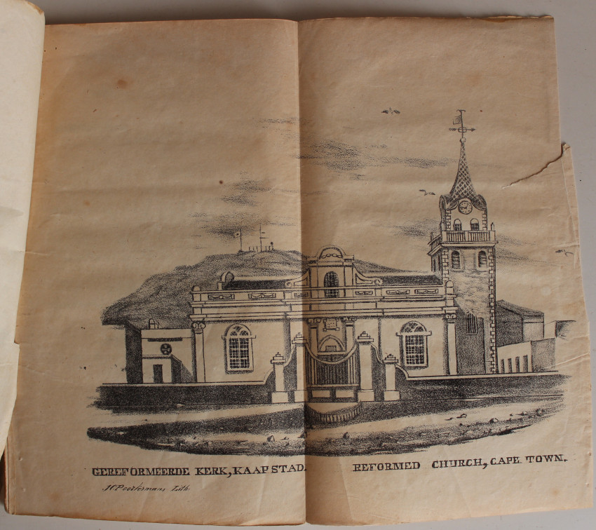 An rare copy of early Cape printing. Stapled with paper wrappers. Some paper loss at edges of wrappers. Previous ownership on front end paper. Fold-out sketch of the Reformed Church Cape Town. The illustrator Johannes Cornelius Poortemans. 126 pages. Sale conditions: Content in good condition, the wrappers almost loose from the stapled book, edgewear to first and last 4 pages.
