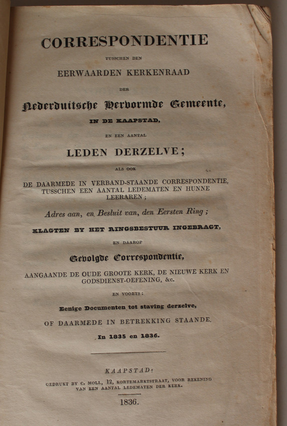 Cornelis Moll opened a printing business at 12 Kortemarkstraat in July 1836. He became insolvent in 1840, moved to Durban, later to Ladysmith, Potchefstroom and Pretoria successively, where he printed various newspapers (in the last-mentioned two places he was assisted by his son C P Moll) (South African Printers and Publishers 1795-1925, compiled by Fransie Rossouw)