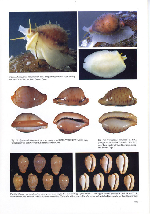Although the primary objective of this study is to concentrate on formerly poorly known species endemic to southern Africa, Angola and Mozambique, detailed accounts of many Indo-Pacific and West African species are also provided. The more than one hundred species accounts contained in the book are accompanied by lucid colour accurate photographs of shell and animal variation, and distributional maps. Many of the species discussed were discovered and described during the past two decades. More recently, others for the first time, were recorded from this biologically unique southern African region. William Liltved, an internationally recognized authority on the systematics of the Cypraeidae, Ovulidae and Triviidae, has produced second enlarged edition of Cowries and their relatives of southern Africa (2000). In the 12 years since the first edition appeared (1989), sufficient new information and material has become available to warrant consolidation in its updated form.