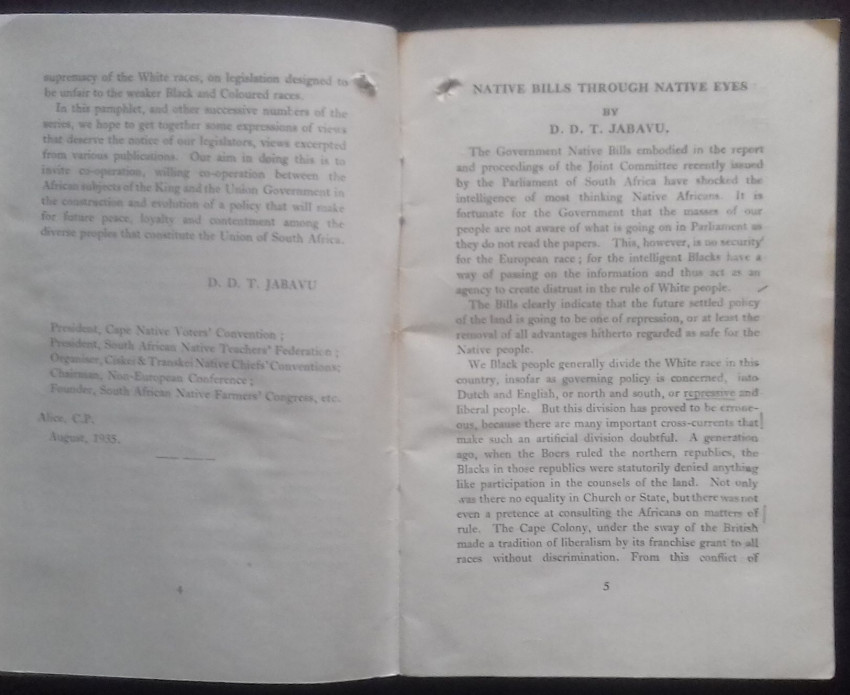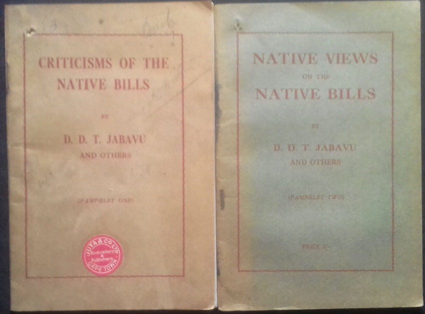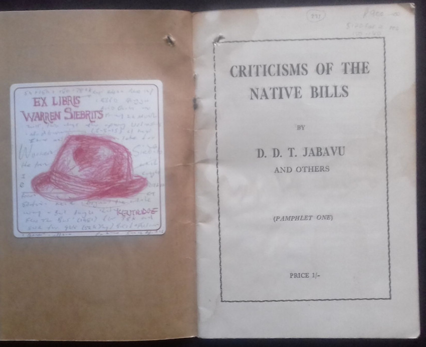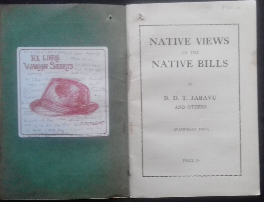 Some staining and notes in pencil to covers and previous bookseller's label fixed to front cover of Criticisms of the Native Bills. Both pamphlets have some rubbing, light edgewear and creasing to covers. Small holes punched through the covers and pages at the top left hand corners of both pamphlets, text not affected. Both have Warren Siebrits' bookplates, designed by South African artist William Kentridge, pasted to inside of front covers. Some stains and notes and underlining in pencil to Criticisms of the Native Bills. A few small stains to the fore edges of Native Views. Both are still well bound.