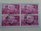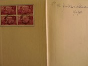It's unusual to find a good first edition with dustjacket, and very unusual indeed to find a cancelled block of 4 mauve one-penny ox-wagon stamps postmarked "Ixopo" cut from an envelope and mounted on the front paste-down. There is a 7/10/48 owner signature on the front free endpaper, but no other markings. The 3-colour dustjacket has been well repaired and is not price-clipped (9s 6d). The beige cloth-boards, crimson to the upper boards and the spine, are lightly rubbed at the spine-ends and upper corners. The binding is slightly out of square. The endpapers and 269 pp of text and glossary are otherwise unmarked and undiscoloured.