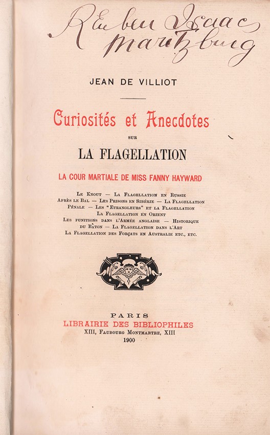 Jean de Villiot was a pseudonym used by several authors and compilers working for the publisher Charles Carrington writing novels and “studies” concerning flagellation, including Hugues Rebell (Georges Grassal), Hector France, Stéphane Arnoulin and Charles Carrington, himself. https://formysir.com/product-tag/jean-de-villiot