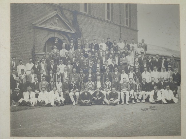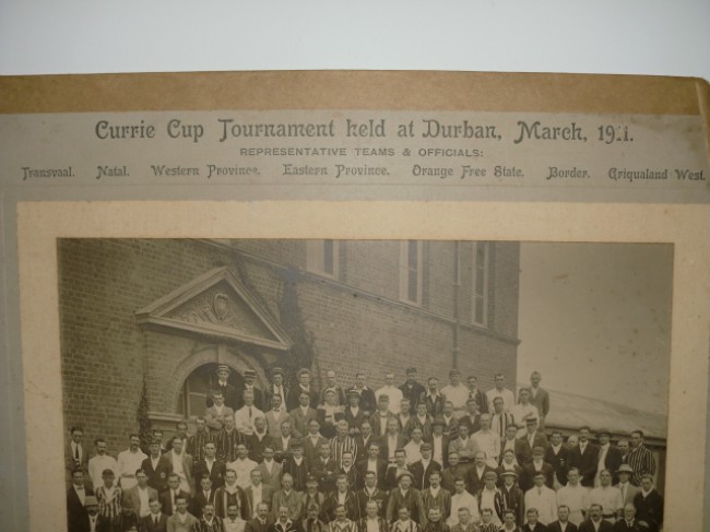 Studio photograph of Representative Teams and Officials of the Currie Cup Tournament held in Durban in March 1911. The photograph is mounted on board, and has a list of all members present from the various provinces.