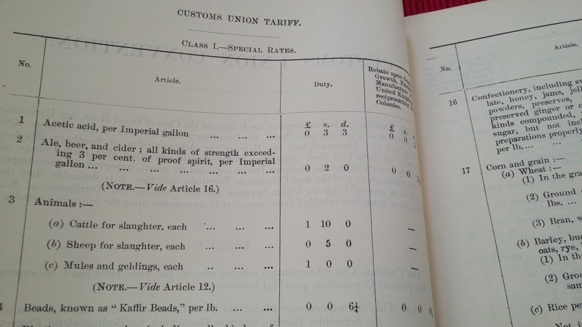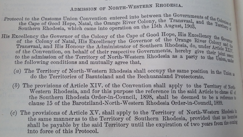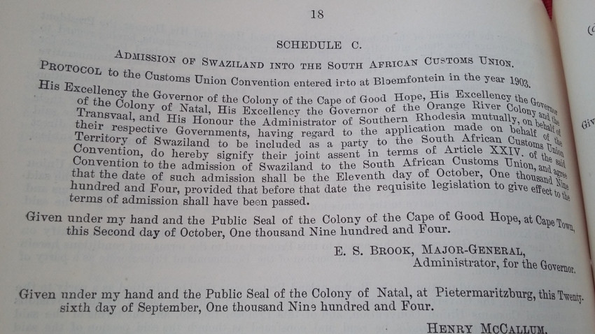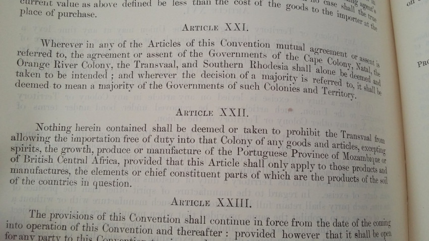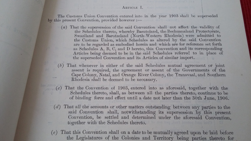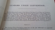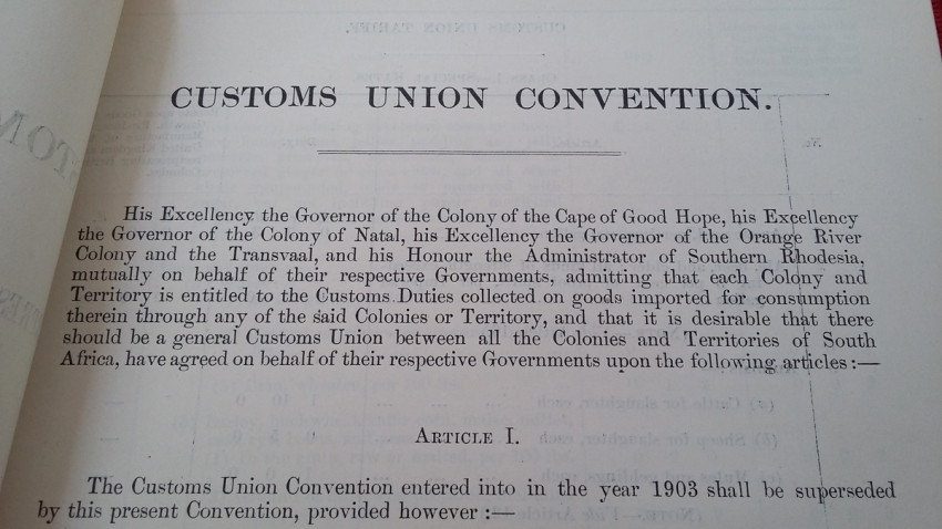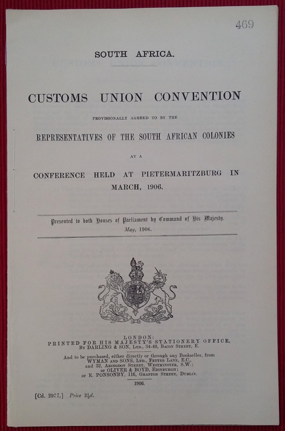 "CUSTOMS UNION CONVENTION provisionally agreed to by the REPRESENTATIVES of the SOUTH AFRICAN COLONIES at a CONFERENCE held at PEITERMARITZBURG in March, 1906."; British Parliamentary Paper [Cd.2977.]; Paper wrappers; Collation complete - 19 pages; Neat number marking to the title page, otherwise a clean copy.