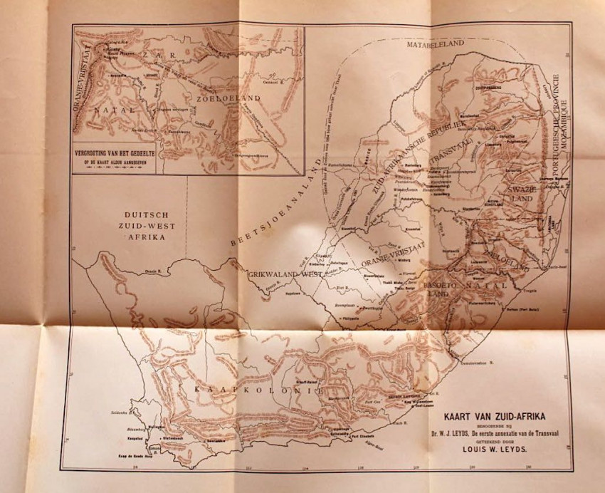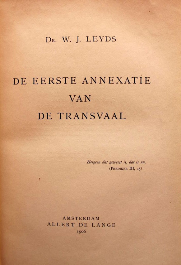 'A statement of the case of the Boers against the British up to the time of the first annexation and the London Convention. "The internal politics of the Republics are not mentioned, but special attention has been given to the relations of the Boers with the natives, when these brought the Boers in to contact with Great Britain." Dr. Leyds is very bitter against Sir Percy Fitzpatrick, and constantly declaims his work, "The Transvaal from Within," which he avers is "an account of things as they were not," and he remarks that "Mr. Chamberlain . . . rewarded Fitzpatrick for his indictment of the Boers . . . by conferring upon him what is sometimes described as the honour of knighthood." - Mendelssohn Vol.I, pages 896-7