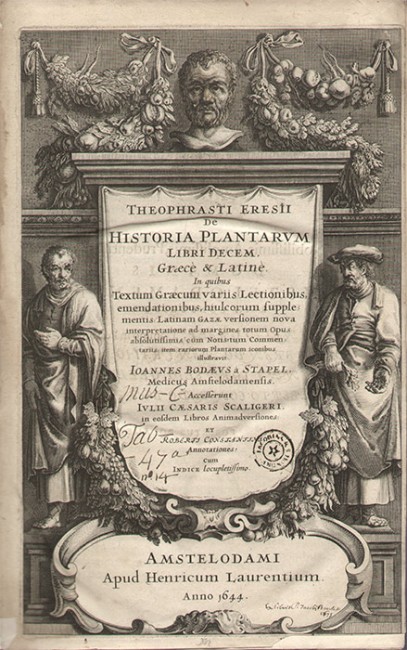 Graece? et Latine?. In quibus Textum Graecum variis Lectionibus, emendationibus, hiulcorum supplementis : Latinam Gazae versionem nova interpretatione ad margines : totum Opus absolutissimis cum Notis tum Commentariis: item rariorum Plantarum iconibus illustravit Ioannes Bodaeus a? Stapel, Medicus Amstelodamensis. Accesserunt Iulii Caesaris Scaligeri, in eosdem Libros Animadversiones: et Roberti Constantini Annotationes. Cum Indice locupletissimo.