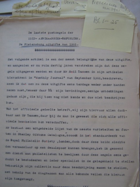 The sections are: (i) \"De laatste postzegels der ZUID-AFRIKAANSCHE-REPUBLIEK. De Pietersburg uitgifte van 1901\" (pp 1-25); (ii) \"Eenige Vervalschingen van Oranje Vrijstaat\" (pp 1-17); (iii) \"The So-Called Envelopes of he Transvaal\" (pages 1-25), with \"Leon de Raay\" at the foot of p 25; (iv) \"Proefvel 1/2d kwaste[?] druk op wit papier\" (pp 27-63 - p 63 is an annotation for \"Complete vel van 24 zegels\" - plus, on better paper, Plate I: \"First printing of the one penny\" and Plate II: \"Second printing of the one penny\"); (v) \"Commando Brief Zegels. Ontstaan daarvan en stryery daaroor\" (pp 1-12); and (vi) two identical photostat sheets (p 19) of six 1900 stamps (1/2 penny to 1 shilling), with three-line handwritten caption.