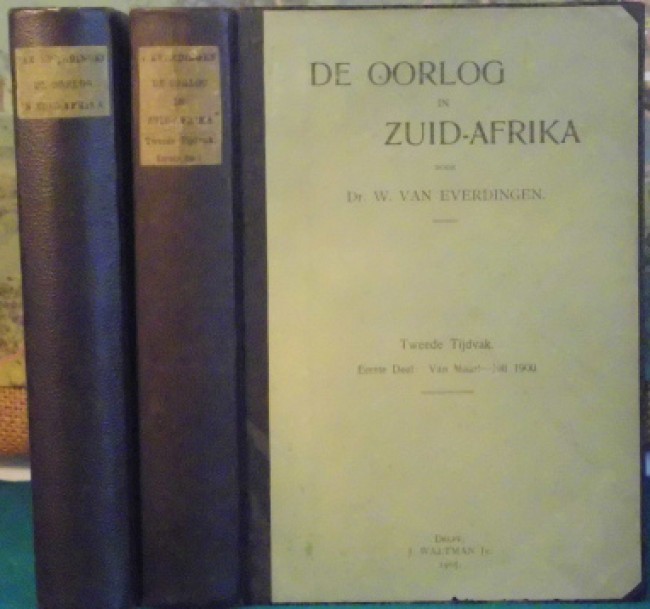 A Dutch view of the Anglo-Boer War, which attempts to portray the woes of the Afrikaner volk in a readable and understandable continuous narrative. Dutch text. 387 + 371 pp with three folding maps. Good condition, re-bound with original covers laid down on boards.