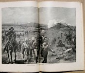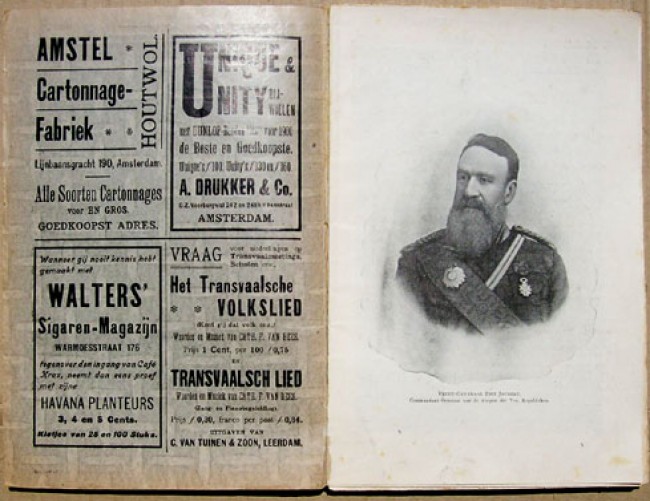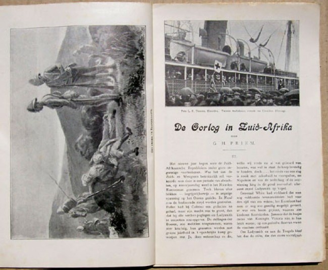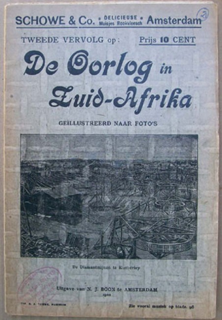 N.J. Boon was a magazine publisher in Amsterdam who also published the item listed as Lot Number 127 on this auction, called "Transvaal Album." This item, "De Oorlog" is the second part of 8 separate booklets. Original pictorial wrappers with black titling on the upper cover and the publisher's advertisements on the lower wrapper. Pagination of this part starts with page 65 and continues to page 96. There are 28 black and white illustrations and a page of sheet music.