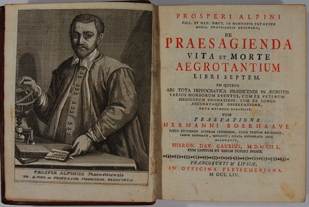 A classic of medical prognosis, first published in 1601. Alpinus classifies the morbid phenomena into genera and discusses their prognostic value.
