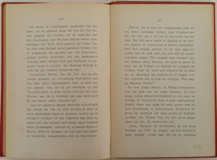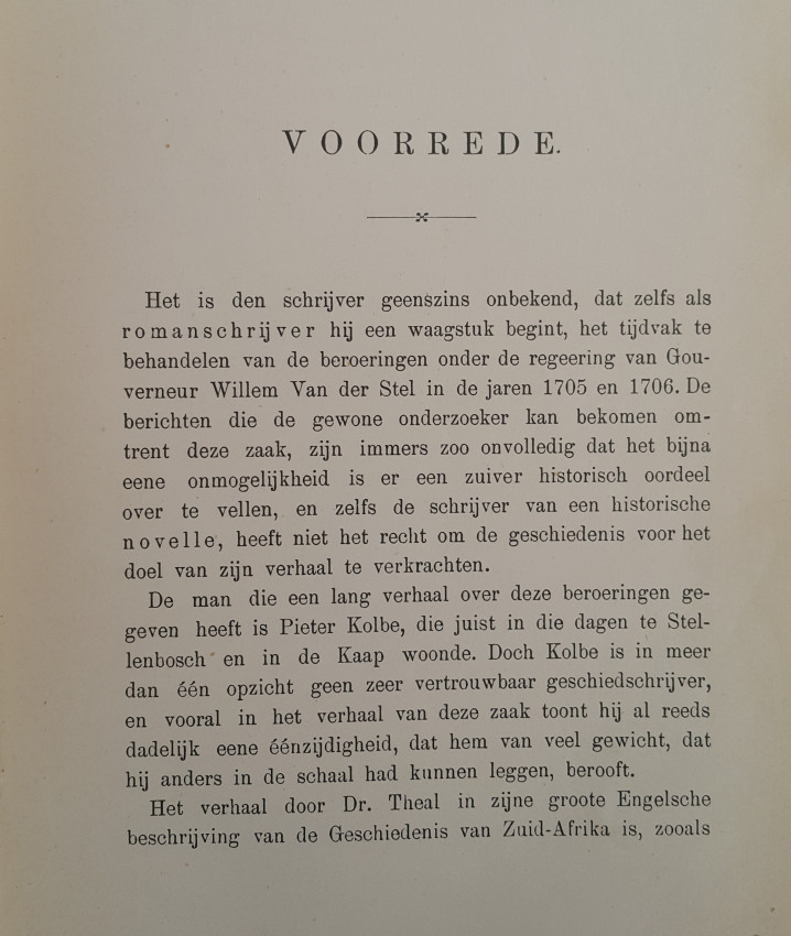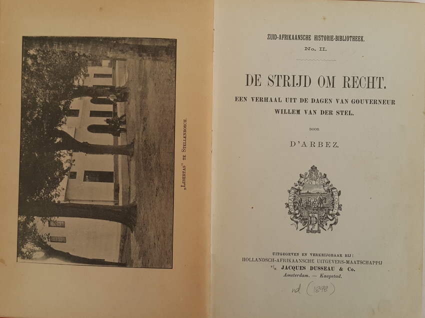 A great controversy - "The van der Stel Controversy" raged between between George McCall Theal and Rev. Leibrandt regarding the merits and demerits of Governor Willem Adriaan van der Stel in the Cape newspapers. Both sides, for and against, gathered partisans as the war continued. D'Arbez records his views on the matter in this little book. The "Contents" are listed at the back of the book, which is written in Dutch. 189 Pages. Binding is good, except for peeling of the covering on the upper spine. The text is in good condition.