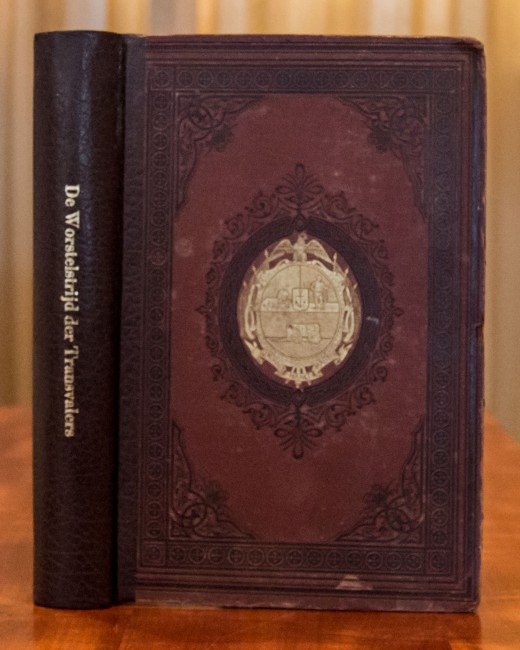 Maroon cloth-boards with black embossed design and gilt coat of arms to the upper board and blind embossed design to the lower board. A new matching Skivertex spine and endpapers have been added with a new gilt title on the spine. viii + 580 pp of text, bibliography and errata, but no index + sepia frontispiece portrait (of a youthful Paul Kruger) and 6 other inserted sepia plates + the Transvaal map.