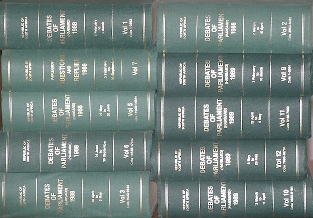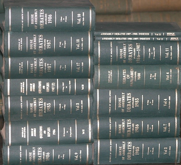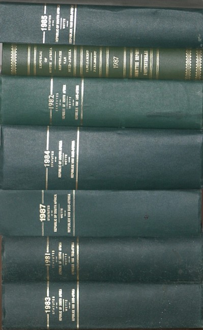 Book conditions vary from Fair to Good. A small stamp - 'United Party Whips' - appear on the flep of most of these editions + Republic of South Africa: Debates of Parliament (Hansard) 1988: pp. 1-2951, 2954-6031, 6034-9183, 11 905-14-543, 14 546-17 055 & 1-2339. 1989: 1-2663, 2665-5183, 5186-7991, 7994-10703. Book conditions vary from Good to Very Good + House of Assembly Debates (Hansard) 1985: pp. 1-2663, 2666-5367, 5370-8319; 1986: 1-2611; 1986/87: 1-2331, 4878-7043, 7046-9367, 9370-11698; 1986/87 Assembly Debates Indexes; 1987/88: 1-2379, 2382-4875; 1987/88 Assembly Debates Indexes; 1988: 1-1407, 9186-11903. Book conditions vary from Good to Very Good + Statutes of the Republic of South Africa 1981, 82, 83, 84, 85, 87 and Committee Reports 1987. Book conditions vary from Good to Very Good.