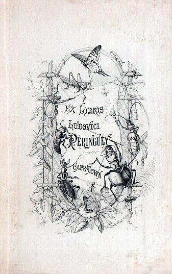 Louis Péringuey (1855-24) was a zoologist, archaeologist and director of the South African Museum. "Seventeen insects (if we include their grubs and even a daddy-long-legs) pay homage to the entomologist L. Péringuey on this lovely plate designed and engraved on steel by J. Migneaux, who usually illustrated scientific works. Only the magnifying glass reveals the full beauty of the original, which shows every leg of the tiny insects perfectly modelled, every hair on a beetle's mandibles convincingly rendered with incredible sharpness." - South African Bookplates from the Percival J. G. Bishop Collection, p. 26