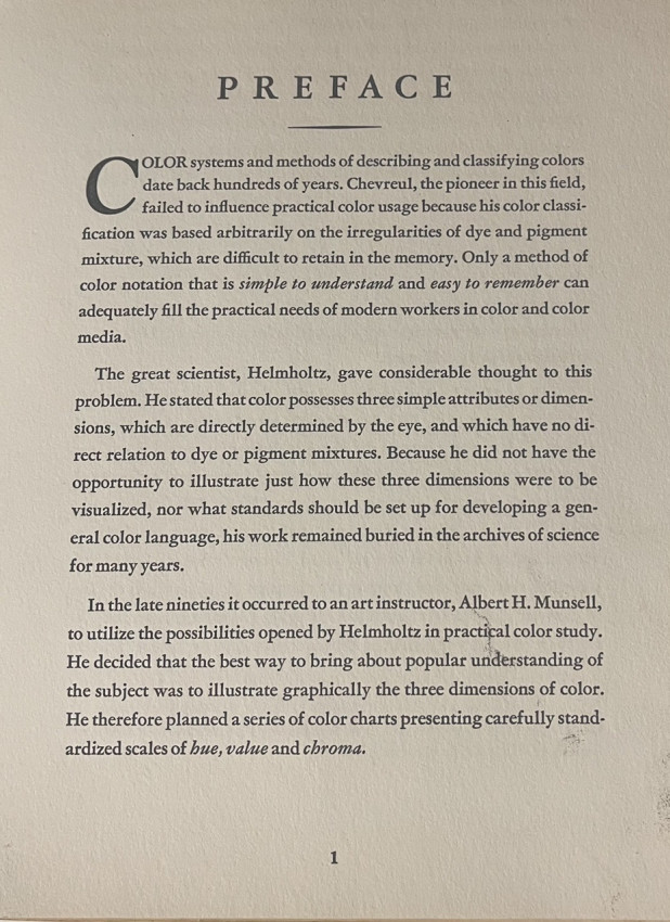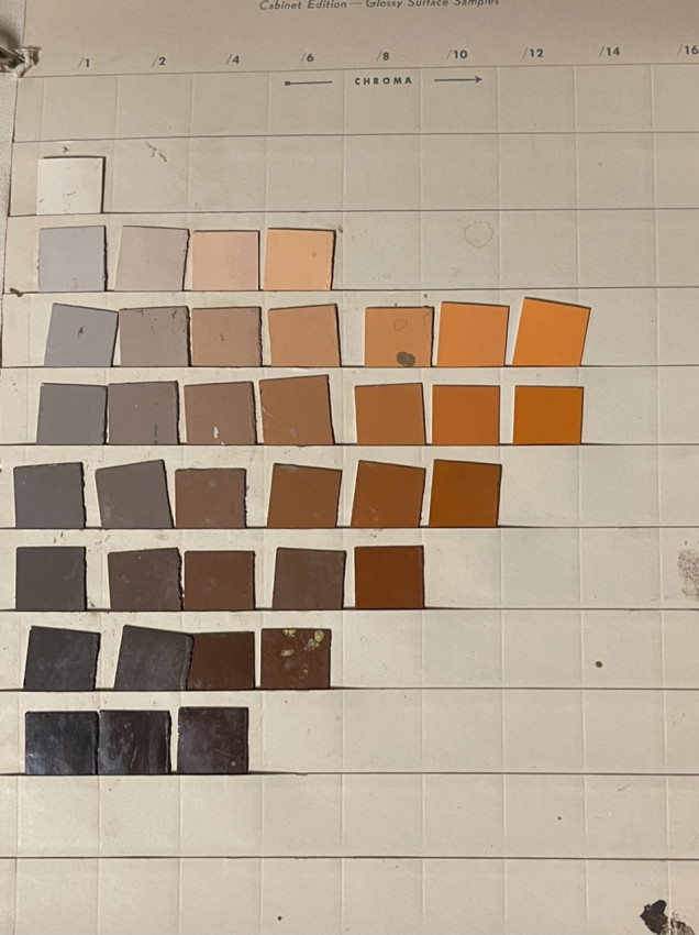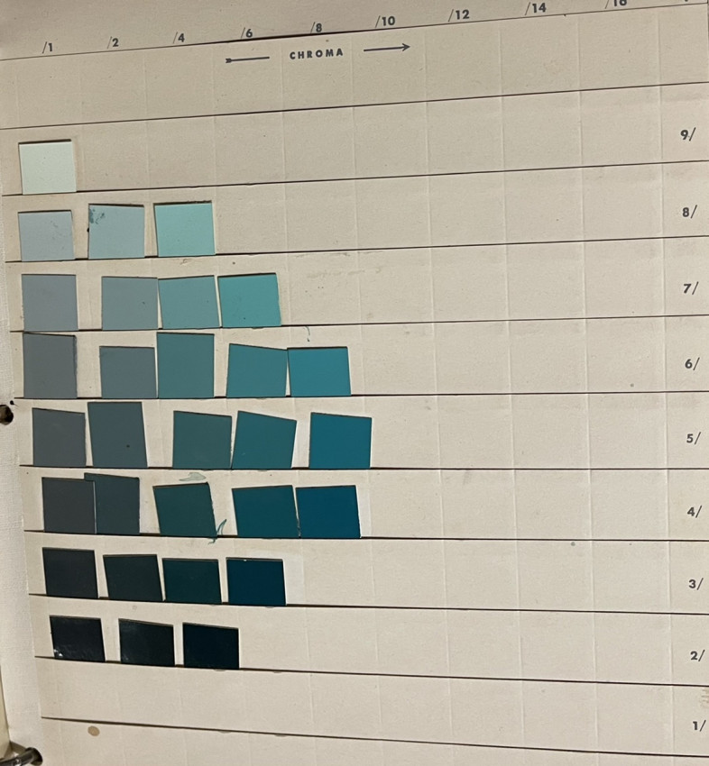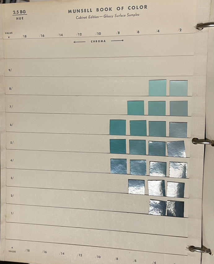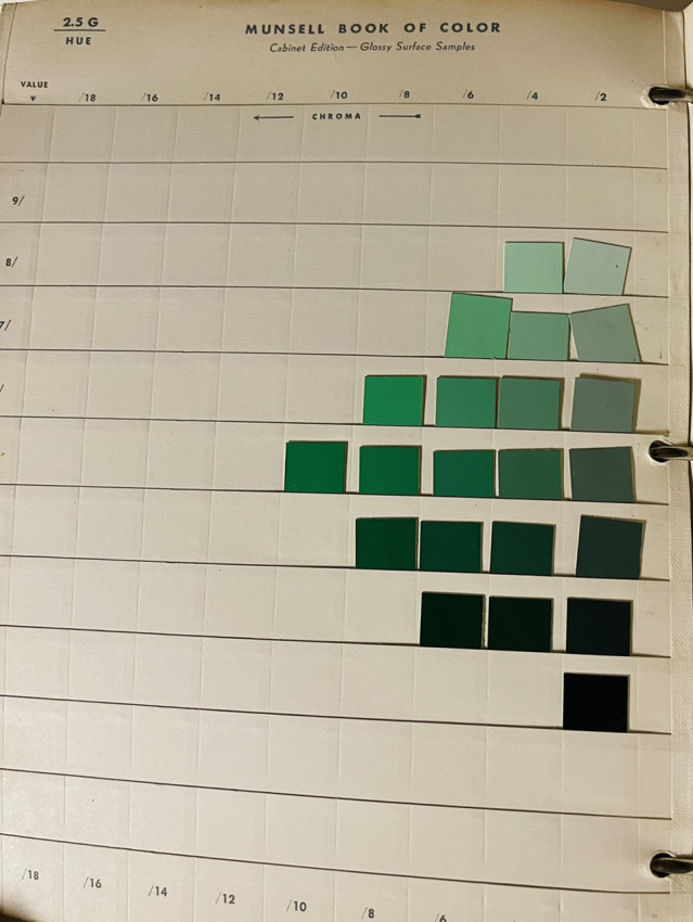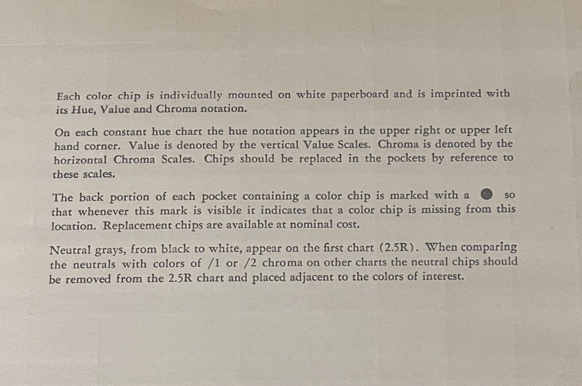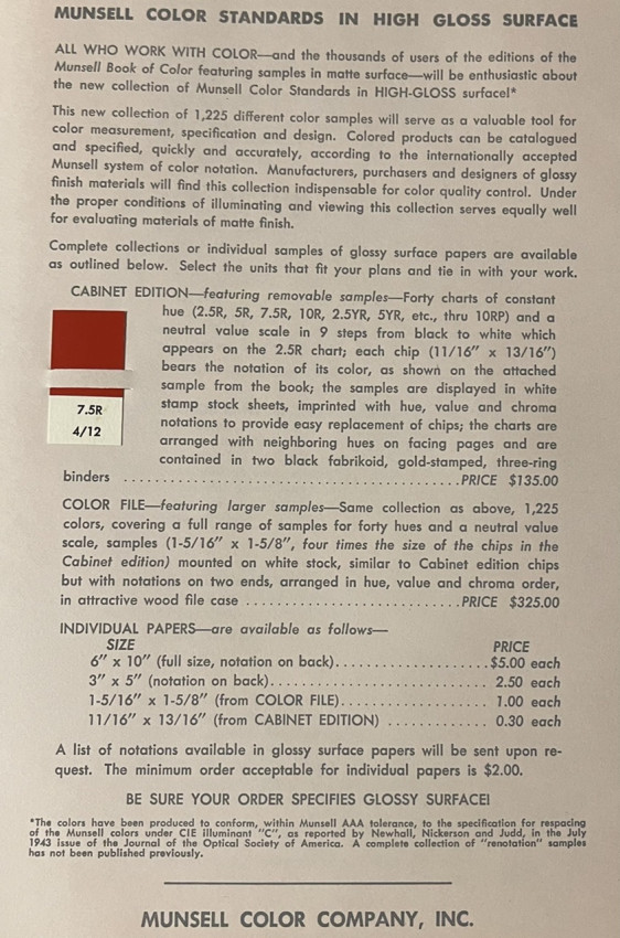 “In the early editions of The Munsell Book of Color, the chips had a matte surface. In 1958, a glossy version was introduced, to improve the reliability of comparisons of the standards to paints, plastics and other materials with glossy surfaces.“ Munsell website.