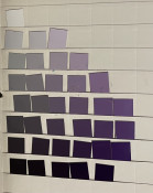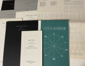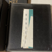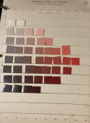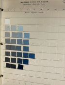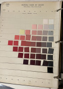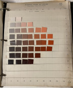 According to the catalog, “ the samples are displayed in white stamp stock sheets, imprinted with hue, value and China notations...,the charts are arranged with neighboring hues on facing pages are contained in two black fabrikoid, gold-stamped, three-ring binders”. (1958 price, $135)