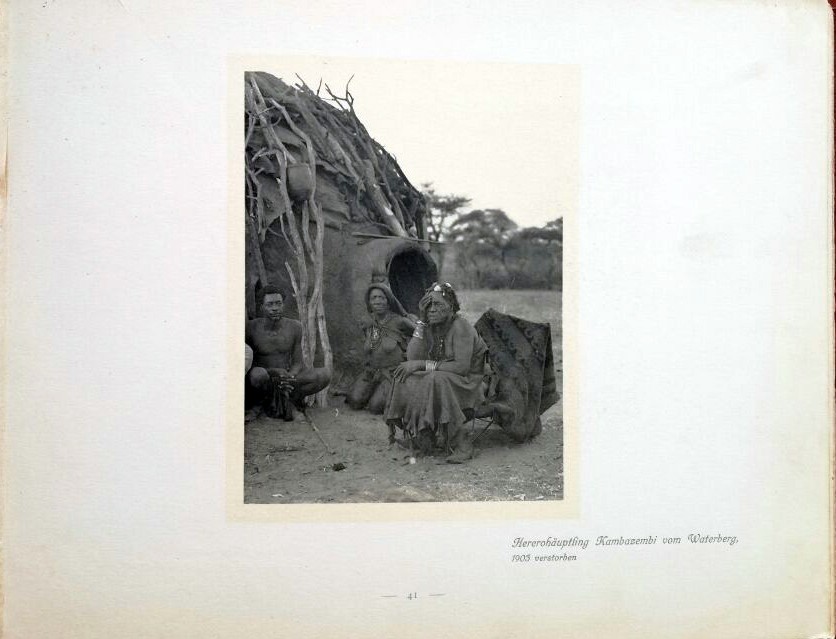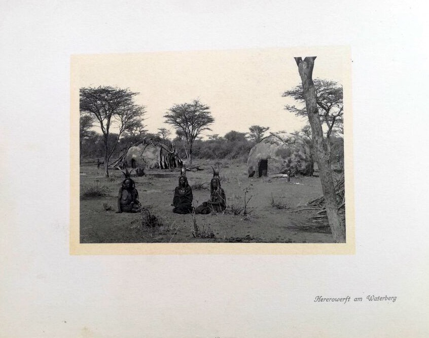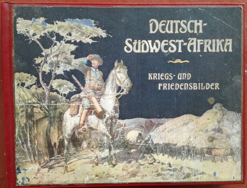 100 original photographs of Frederich Lange in Windhuk. 15 pages of text in German to rear. Fold-out colour map. Coloured embossed pictorial cloth with a mounted German Schutztruppe with a transport oxwagon in the background. All edges gilt. Has been carefully recased with maroon leather and new endpapers. Plate 18 is loose, there are two additional photographs which are loose taken of Windhoek much later. The first 5 pages have a small piece missing from upper edge and page 63 has a piece missing which does not affect the plate. A beautiful book showing views of Windhoek, Swakopmund as well as landscapes, ethnic herero, damara and ovambo peoples, flora and fauna.