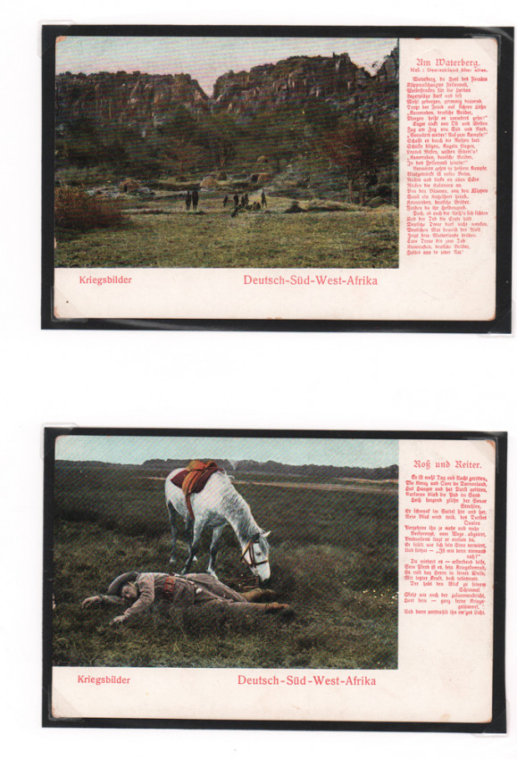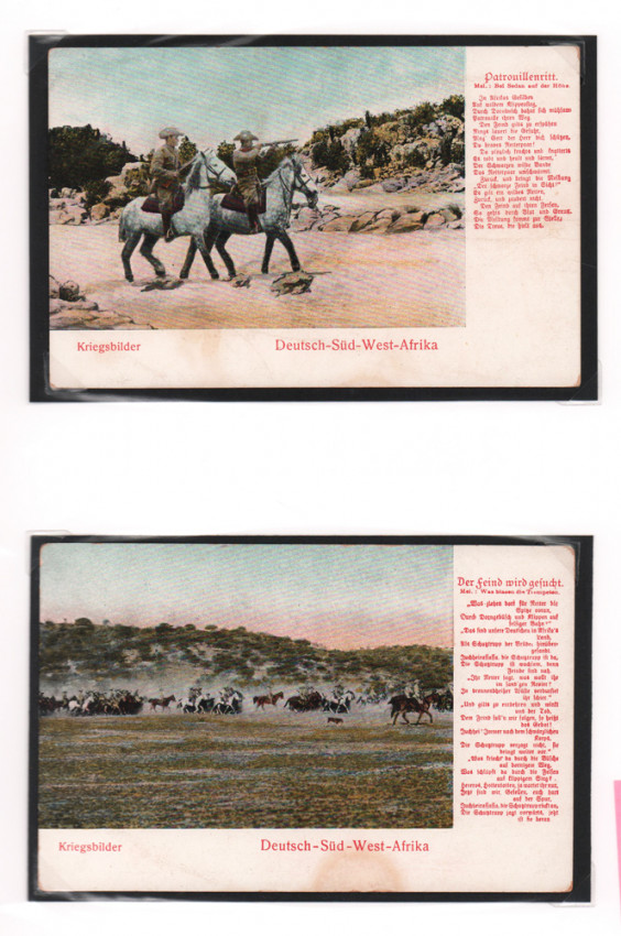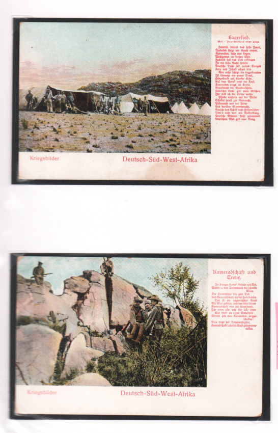 13 postcards (90 x140 mm) - war images of German South West Africa during the Herero Revolt housed in a plastic sleeve portfolio. None of them are dated but all have explanatory captions printed on the right front side in red Gothic script. They are general images, but Waterberg is mentioned specifically in one of them Underneath each postcard is printed Kriegsbilder Deutsch -Süd - West Afrika. The publisher’s name is printed on the verso of the postcard. They all date from circa 1904 – 1907, and are in good condition, and are unused.