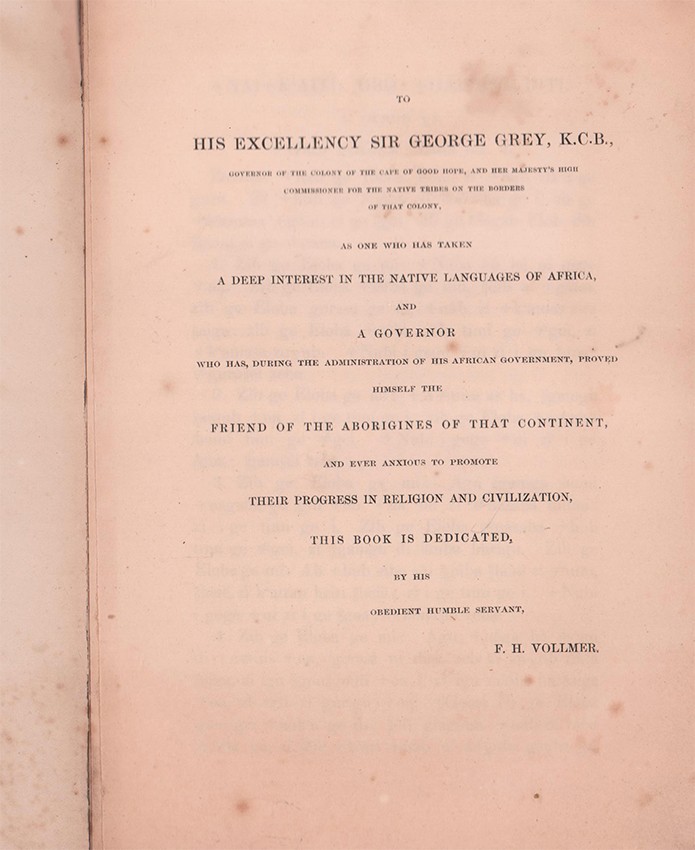 Darlow (T.H.) and Moule (H.F.): Historical catalogue of the printed editions of the Holy Scripture vol 11.2 no 6957 page 1187: A volume containing selections from the Bible and other matter prepared by F.H. Vollmer of the Rhenish M.S. The volume is dedicated to Sir George Grey then Governor of the Cape. The selection from Scriptures end of page 146 and are followed by a Lutherancatechism and hymns, An extra leaf contains a list of errata.