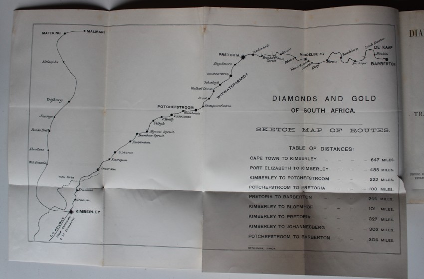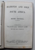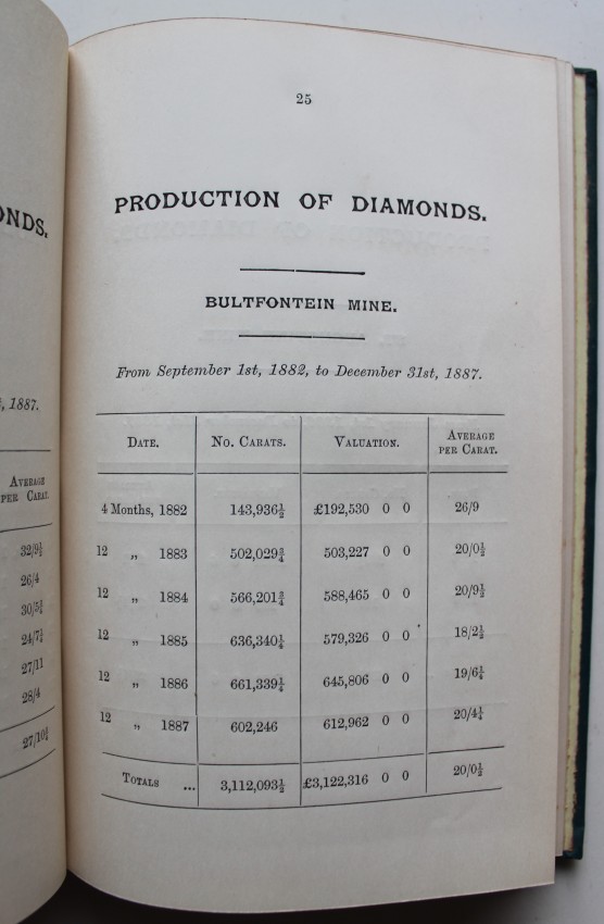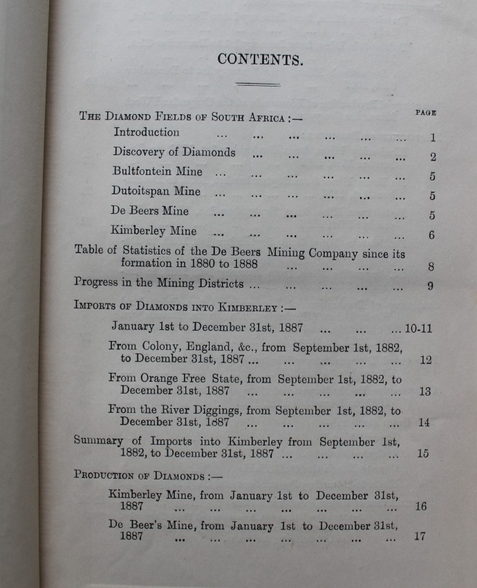 Content on the discovery of diamonds, Bultfontein Mine, Dutoitspan Mane, De Beers Mine and Kimberley Mine. Table of statistics of the De Beers Mining Company since its formation in 1880 to 1888. Imports of diamonds into Kimberley, production of diamonds, exports of diamonds, the gold fields, South African stock and share lists, law of the Transvaal on digging for and dealing in precious metals and precious stones, powers of attorney...