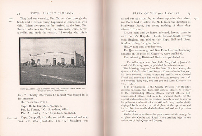 Mendelssohn (Sidney) South African Bibliography volume 1 page 372: This work has been compiled from the diaries of the authors, assisted by other officers of the regiment, and recounts its operations during the war in South Africa. Instructions to start mobilising were received as early as September 8, 1899, and three days later definite orders were sent to prepare for immediate departure to the Cape. The troops were entrained at Muttra, on September 20th, the force consisting of 16 officers and 475 rank and file, with 518 horses, and they arrived at Bombay on the 23rd. The next day they embarked for Cape Town via Durban, and near this port they met with a violent storm, in consequence of which many of the horses were lost ; however, they reached their destination safely, and were immediately sent up country to join Lord Methuen's army at the Modder River.