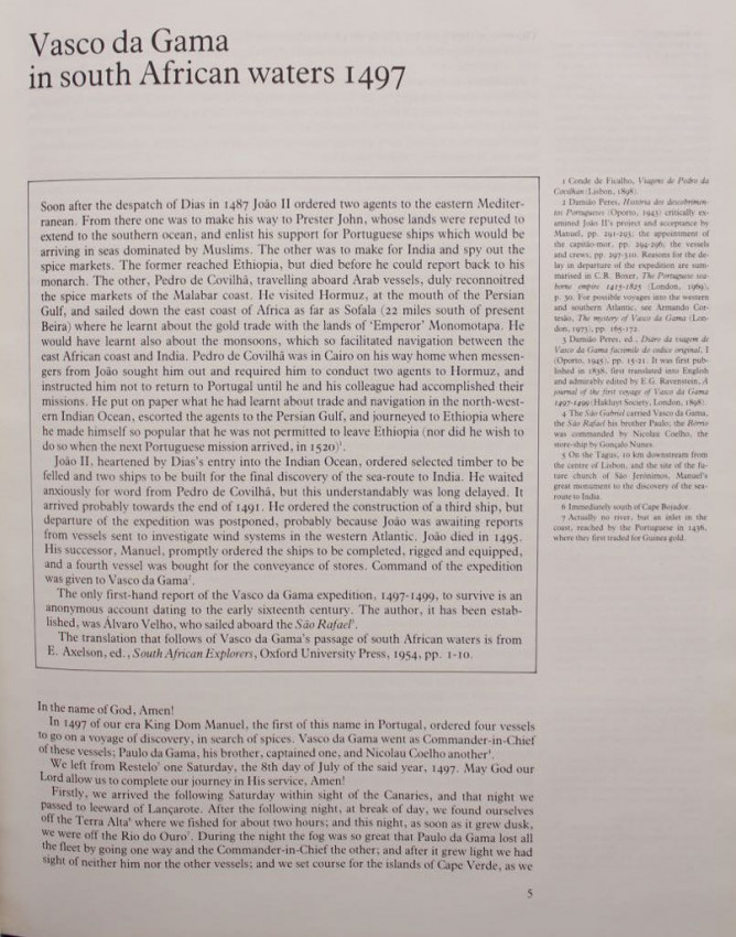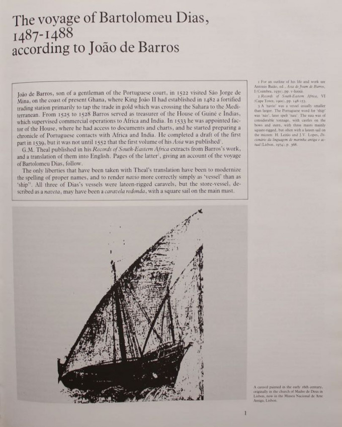 This volume, published on the fifth centenary of the voyage, contains information about the Dias voyage and subsequent Portuguese maritime activities in south African waters; it includes a section on the development of Portuguese nautical science, especially of maritime cartography, during the period of the Discoveries and into the seventeenth century.' - Editor's note