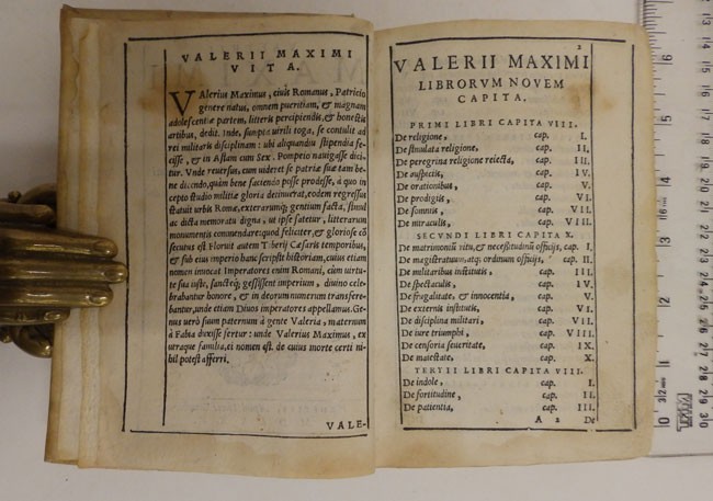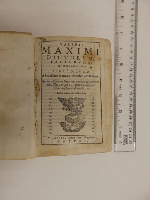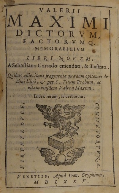 A collection of memorable deeds and sayings compiled in the first century after Christ; the work was again very popular in the Middle Ages and Renaissance. This edition of Sebastiano Corrado (d. 1556), a pupil of Battista Egnazio, is first recorded printed in 1545. A rare printing, not in Adams.
