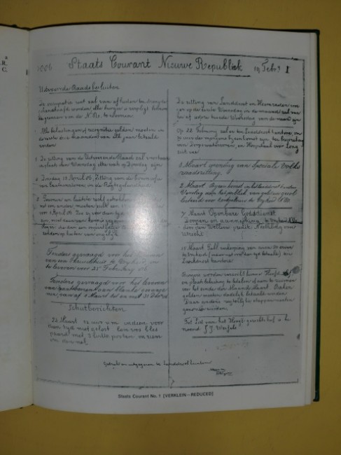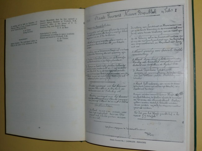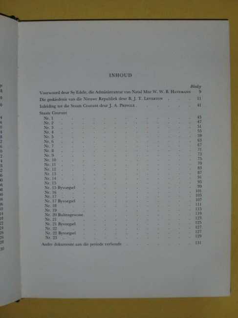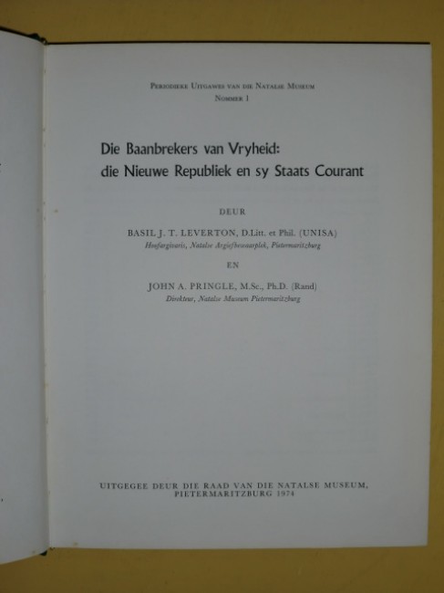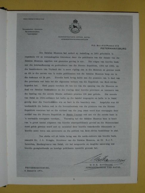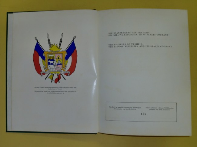 Copy number 135 of 1000 Limited Edition copies. A rather scarce book from the series \"Occasional Publications of the Natal Museum - Number 1\" containing 23 Staats Courant articles relating to The Nieuwe Republiek area of Utrecht/Buffalo River, and the history relating to the original Boer settlers in the area, and the further influx of Dutch settlers after the abortive \'Klip River Rebellion\' of 1847, as well as their relations with the Zulu chief Panda, and their attempt to gain official recognition of their settlement; comprising reproductions of Government Notices pertaining to auctions, land claims, curfew notices, taxes, beacons, allocation of farms, financial affairs, education, the Boer deputation to Europe, and including some portraits, sketches, reproductions of documents. In 141pp., the left pages being in English and the right being in Afrikaans. Book condition: green boards very good, gilt coat-of-arms on front cover (\'Eendragt Regtvaardigheid En Liefde\', with ox-wagon and shield design detail), end-papers foxed and spotted with evidence of library sticker removal on inside front pastedown, edges faded, otherwise contents very good. Limited edition. Scarce.