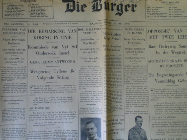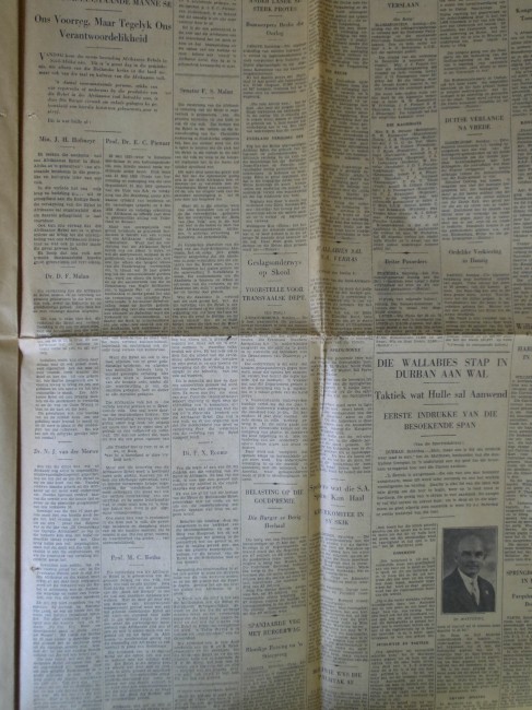 Complementing the feature were a leader article and three columns of contributions from such luminaraies as J H Hofmeyr, D F Malan, N J van der Merwe, E C Pienaar, M C Botha, F S Malan and F X Roome.