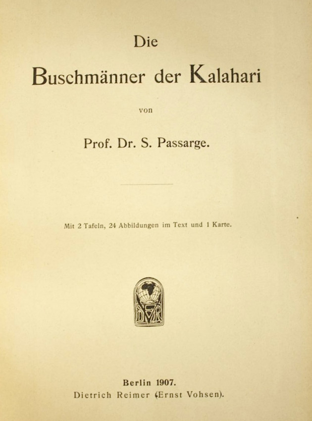 Siegfried Passarge (1866-1958) was a geologist, ethnographer and Professor in Geography at the universities of Berlin and Breslau. He travelled extensively throughout Southern Africa and wrote and published account on the physical geography of the Kalahari desert in 1904. His account of the Bushmen people of the region followed three years later. His travels in Southern Africa occurred during the period of the Anglo-Boer War and he published an account of the outbreak of hostilities in 1899. Passarge's theories of racial geography were embraced by the Nazi Party after 1933.