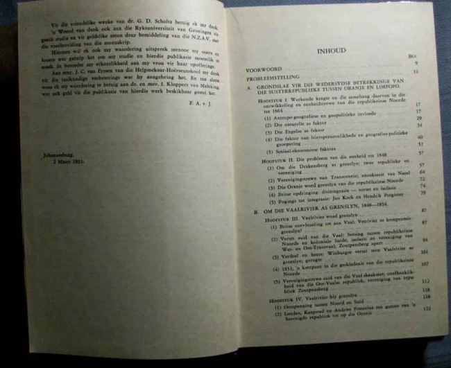 Hierdie werk is in manuskripvorm as proefskrif aan di Ryksuniversiteit van Groningen, Nederland, op 20 September 1950 onder die opskrif " Die politieke betrekkinge tussen die Suid-Afrikaanse Republik en die Oranje-Vrystaat 1836-1899" voorgele.