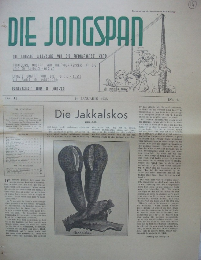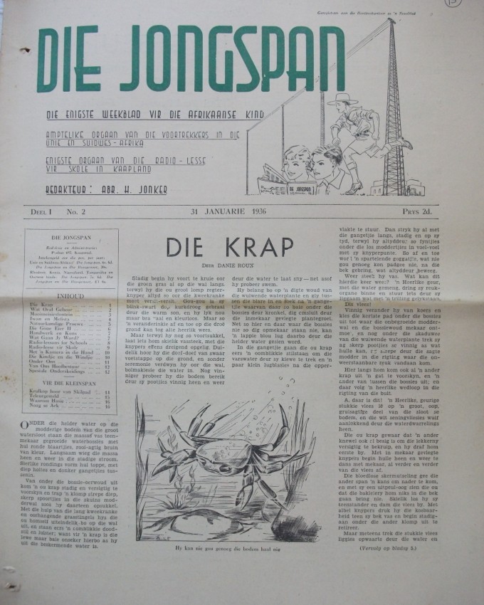 Printed in 2 colours on high-quality newsprint, Die Jongspan was the official organ of the Voortrekkers (similar to the Boy Scouts and Girl Guides) "in the Union and South West Africa". These first two copies were published 80 years ago. The post-free subscription rate was six shillings and sixpence a year (65 cents) or one pound (two rands) a year with Die Huisgenoot.