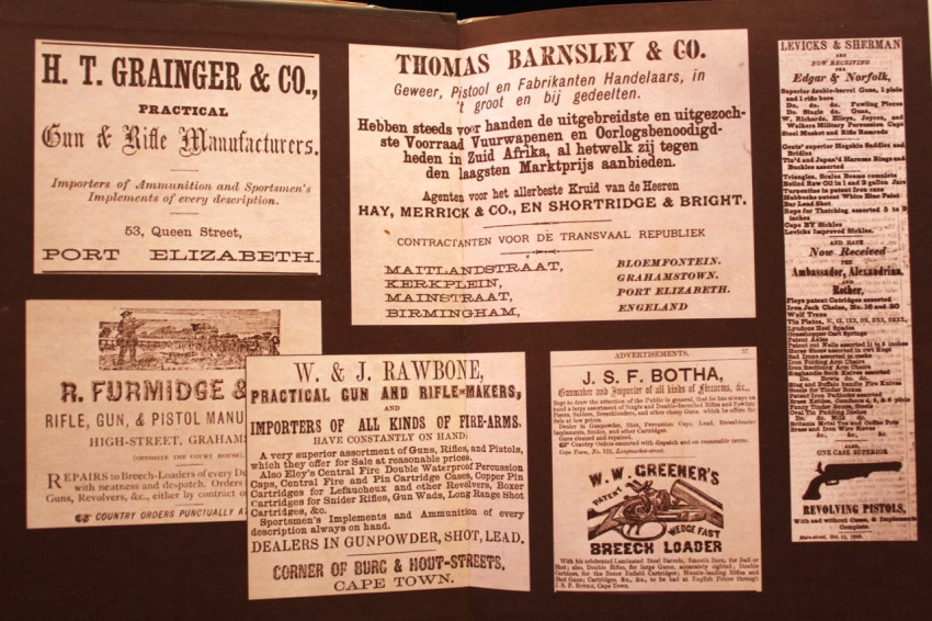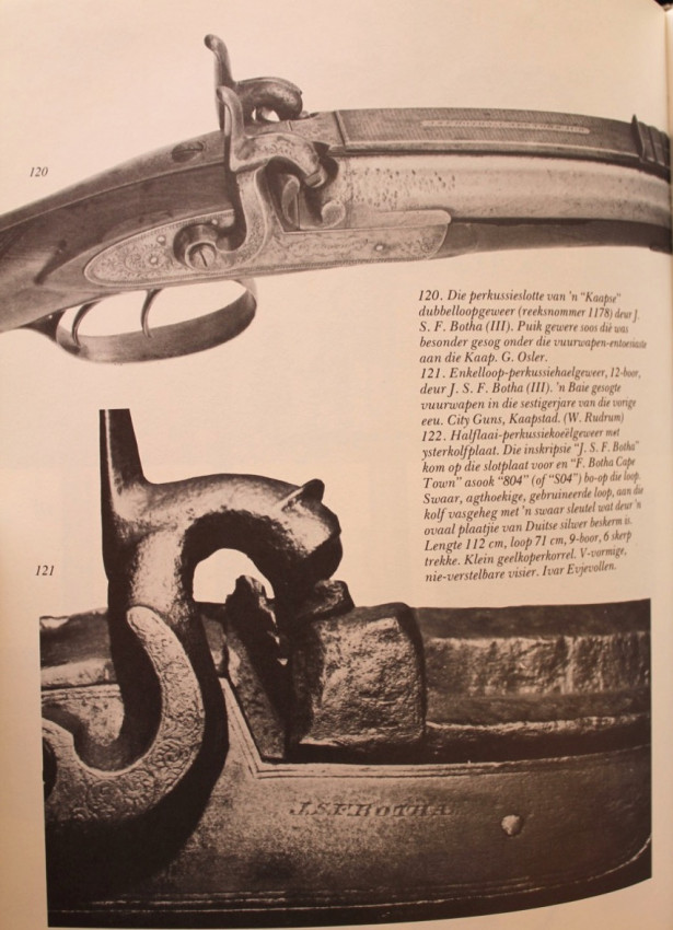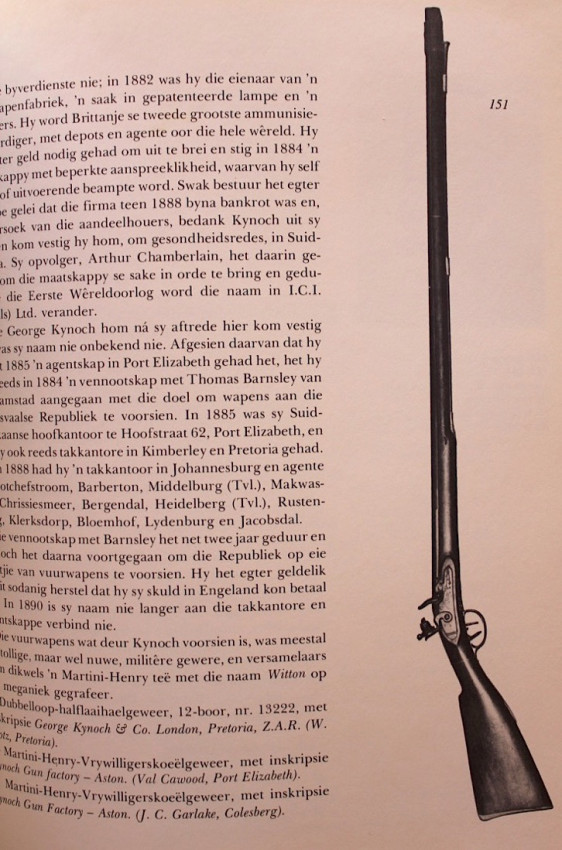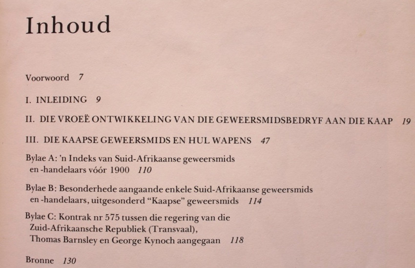 Jarelange navorsing het 'n magdom van interessante feite aan die lig gebring omtrent die persone wat vuurwapens voorsien het aan die Voortrekkers, die vermaarde grootwildjagters, die kommando's en die Vrywilligersregimente wat tussen die jare 1800 en 1900 in die Grensoorloë diens gedoen het. Die boek bevat foto's van sommige van die seldsaamste en beroemdste vuurwapens in Suid-Afrika.'