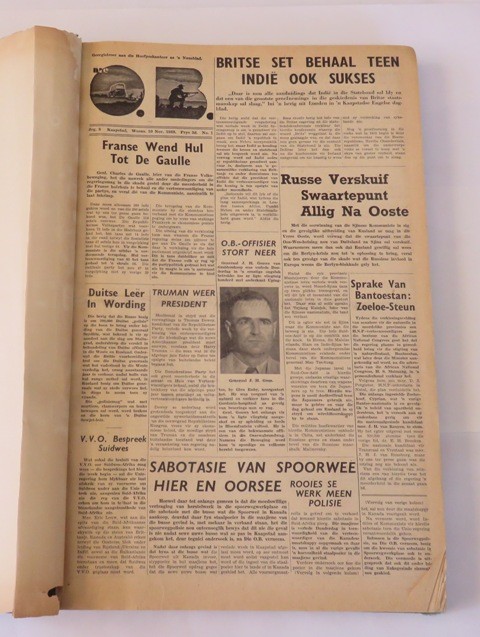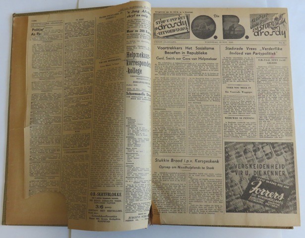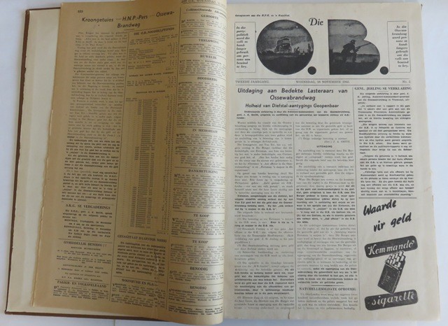 Die O.B. was the mouthpiece of the Ossewa-Brandwag formed in Bloemfontein on 4 February 1939 by pro-German South Africans. The three volumes of newspapers cover the period 11.11.42 to 3.11.43; 22.11.44 to 7.11.45 and 10.11.48 to 2.11.49. Much coverage is given to the speeches of the organization's leader. The newspapers provide deep insight into the objectives of the Ossewa-Brandwag and the anti-Semitic, anti-capitalistic, anti-Smuts and anti-Empire beliefs. The paper describes how South Africa would look if they took power with their "Volksregering" where a farmer would be minister of Agriculture, a railwayman of the Railways and a teacher, of Education. Afrikaners would own the mines and no overseas capital would be allowed. Newspapers would only inform readers- there would be no arguments or disagreements published. They also opposed D.F. Malan and no coverage is provided of Smuts winning the July 1943 general election. A disturbing view of a troubled time in South African history.
