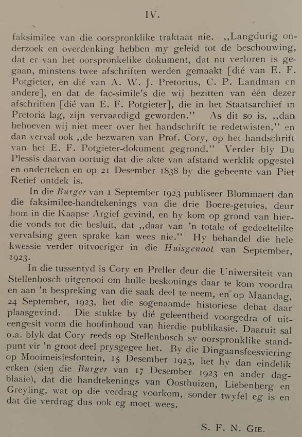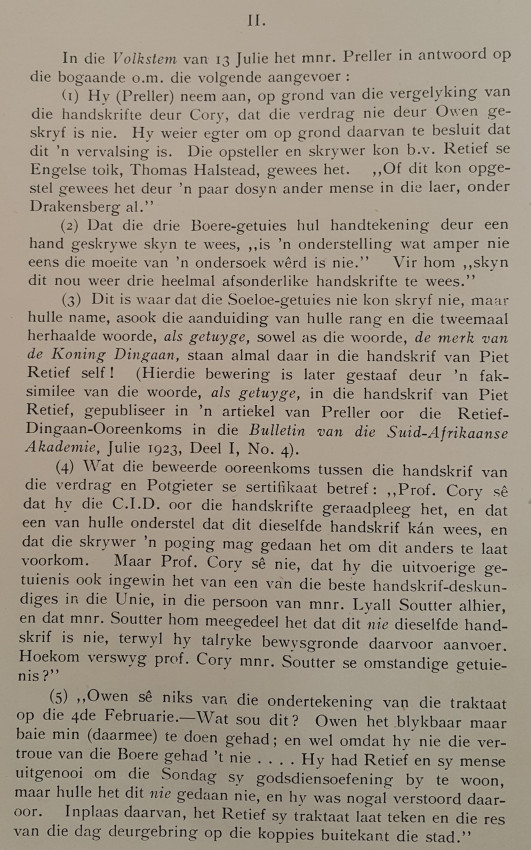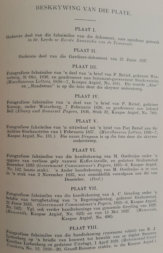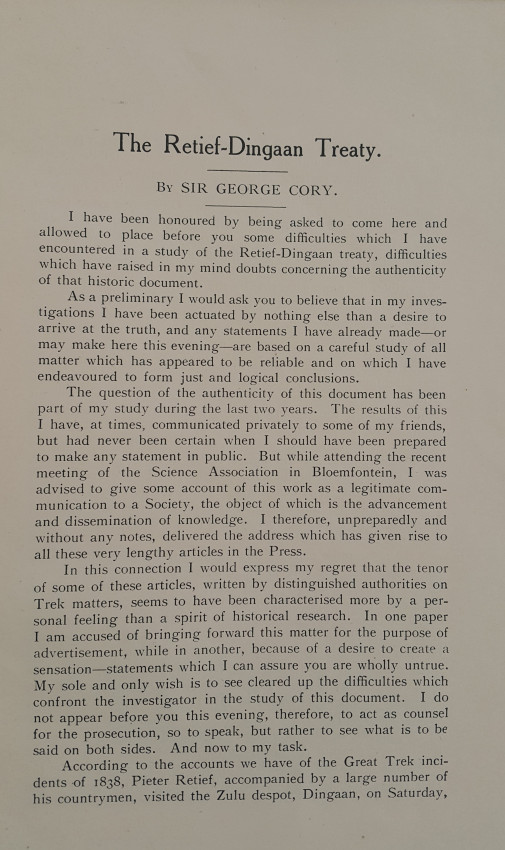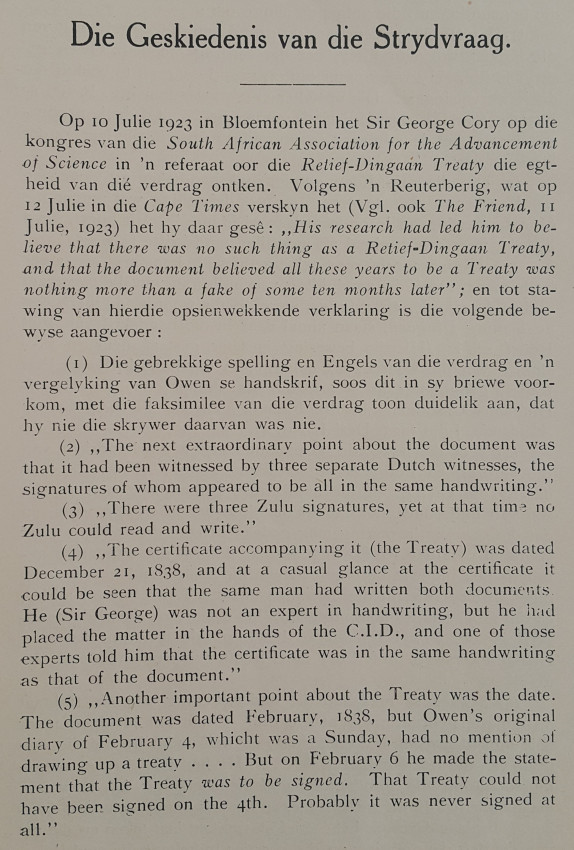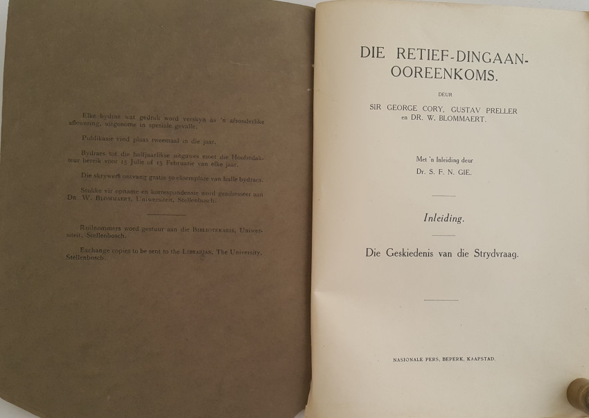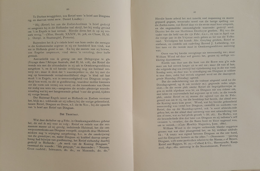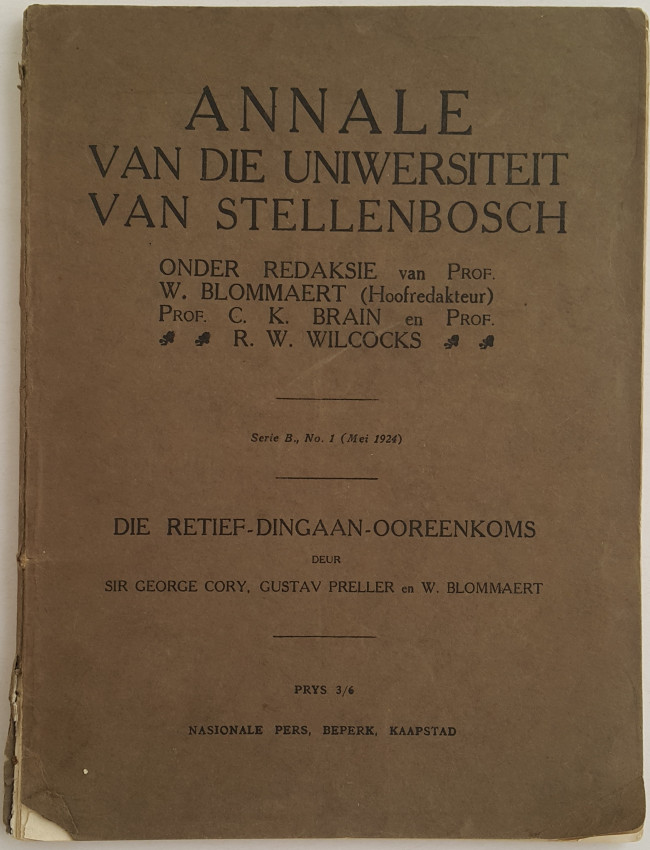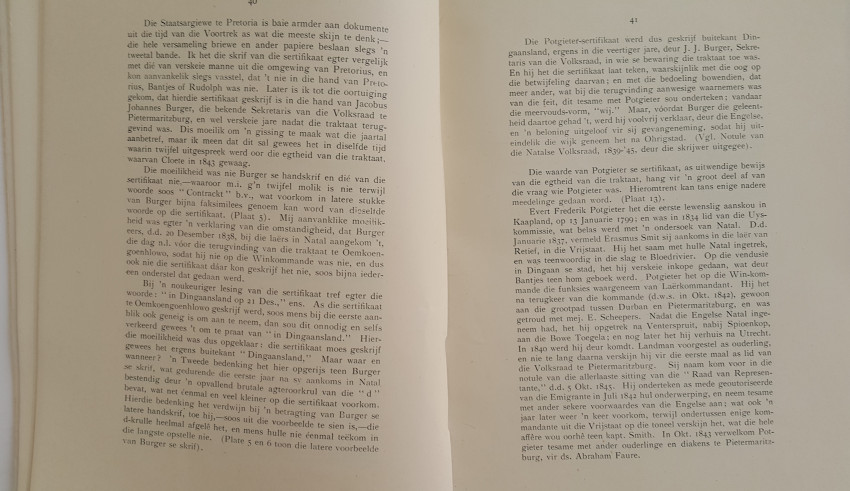 A journal of 95 pages in brown paper wrappers which are cracking from age at the foot of the spine. The text and illustrations are in good condition. This edition of the "Annals of the University of Stellenbosch" records the history of the extremely interesting controversy as to whether the contract between Piet Retief and Dingaan was a forgery, or not. I won't reveal the outcome, not to spoil the story.