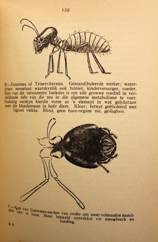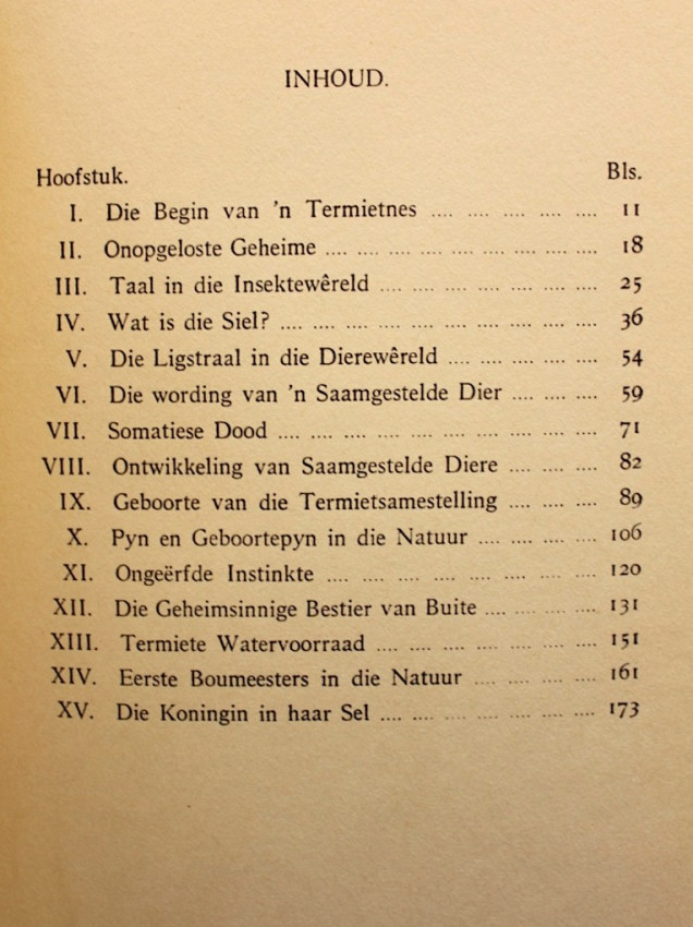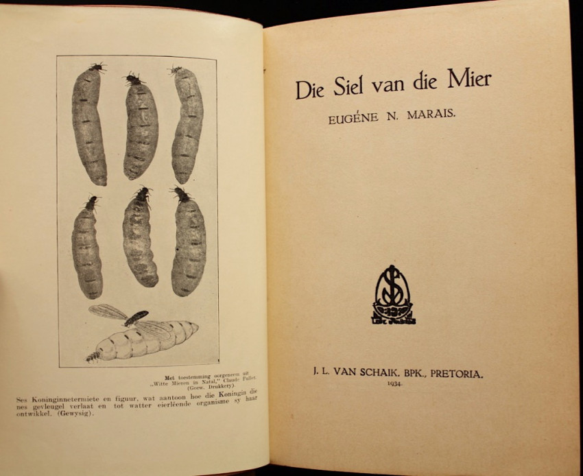 A rare first edition of the legendary Afrikaans author's groundbreaking work on the life of termites which is regarded as the forerunner of the hive mind or collective intelligence hypothesis. This work initially appeared periodically in the Afrikaans magazine Huisgenoot during the 1920's. The Belgian Nobel laureate Maurice Maeterlinck translated this work into French and infamously published it under his own name.