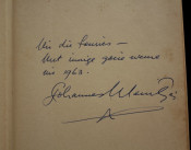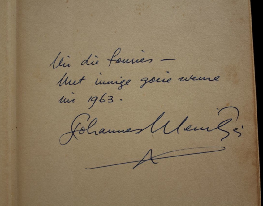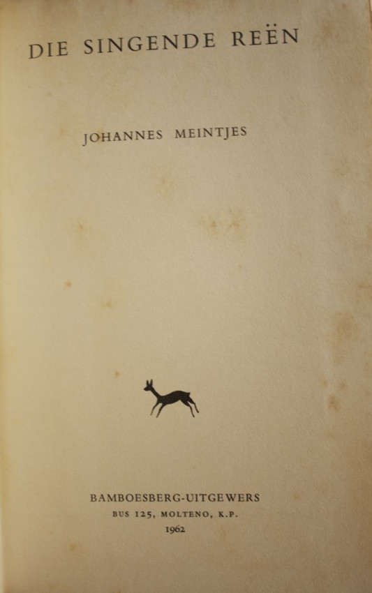 A period-signed copy. The gift inscription by the author on the front end paper reads: "Vir die Fouries - Met innige goeie wense vir 1963. Johannes Meintjes."