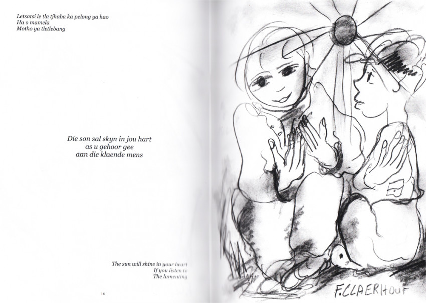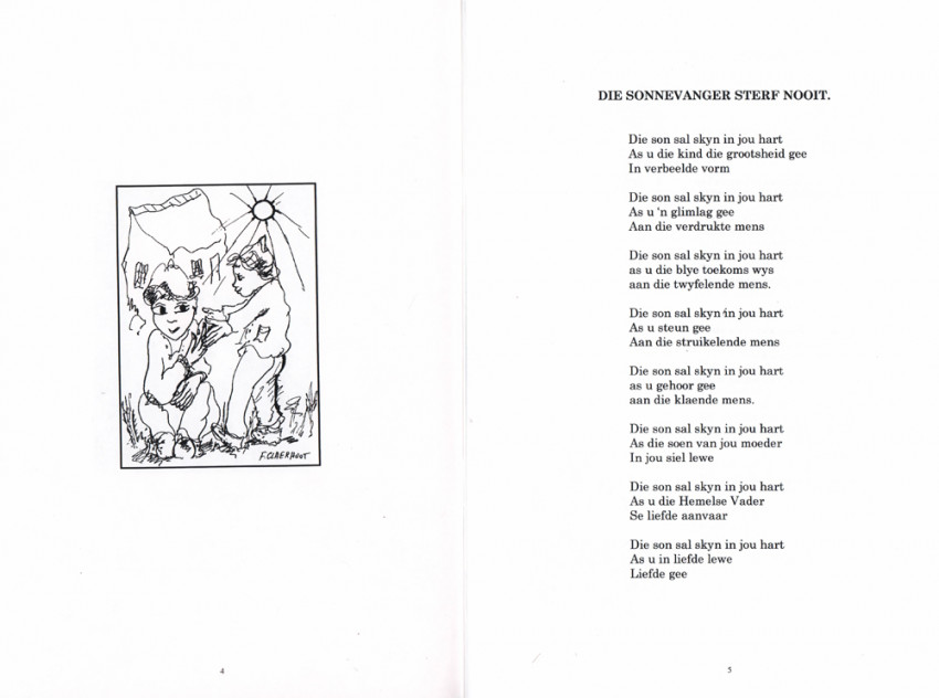 The poem Die Sonnevanger sterf nooit is translated into English and Sesotho. All the drawings have captions in English Afrikaans and Sesotho.
