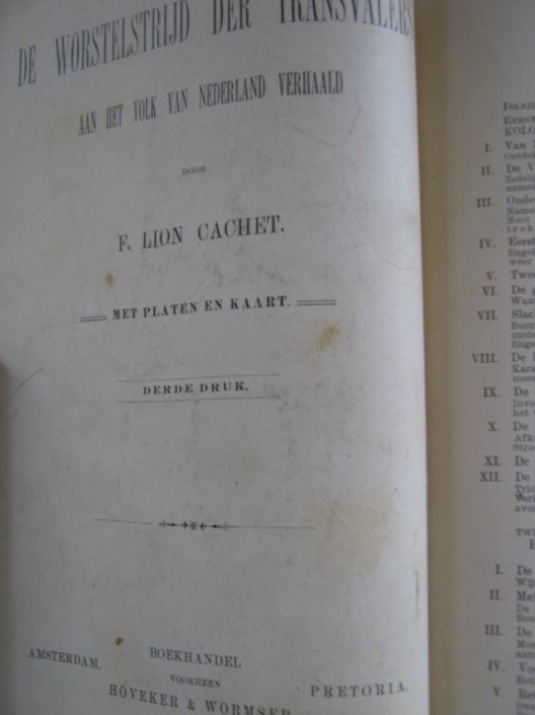 Lion-Cachet covers the history of the Transvalers from the days of their forebears in the mid-seventeenth century up to the Jameson Raid. Although this edition was completed in Rotterdam as late as 16 December 1898, the author was still not able to forecast that war would break out only a year later. Instead, he ends with a question, which may be translated as: \"Will the Transvaal, as a Republic, fulfil its destiny by finding a way to bring about a strong and prosperous Confederation of United States of South Africa, independent of Great Britain?\"