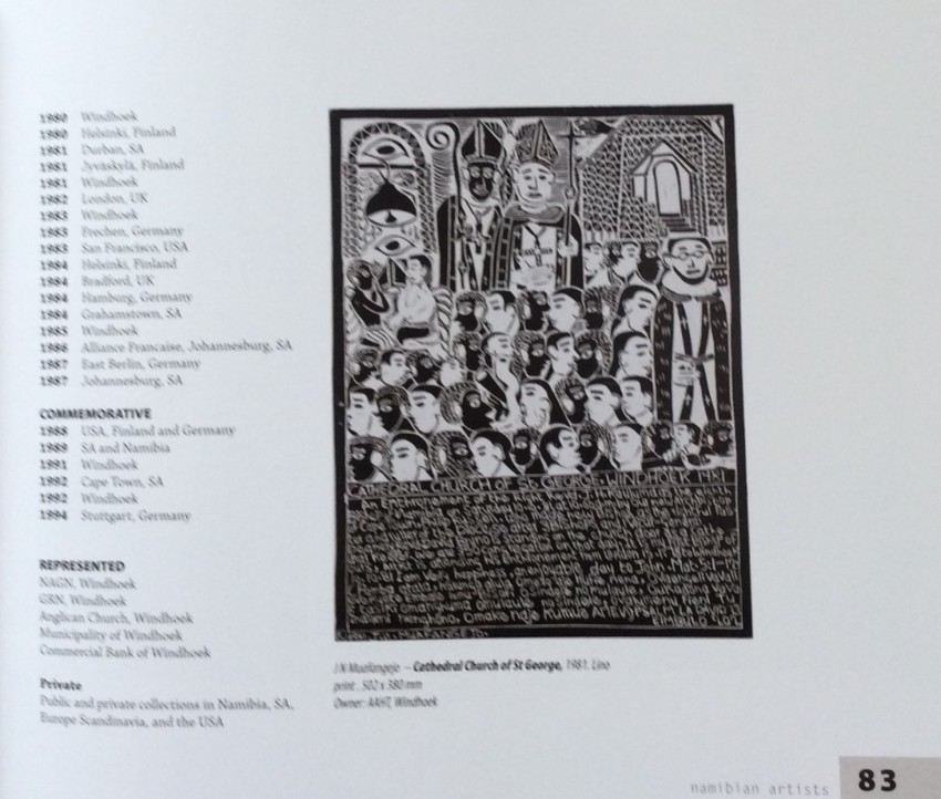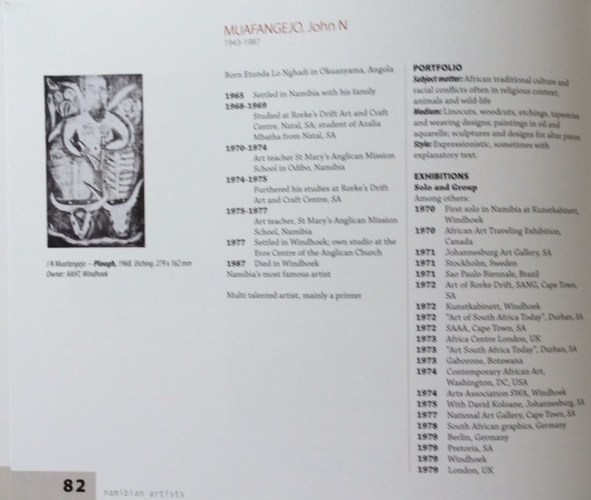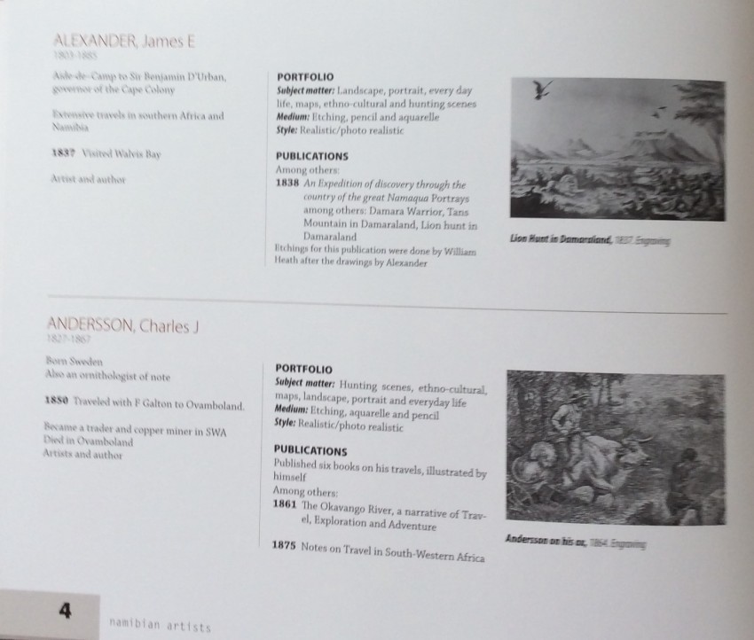 The contents include a 31 pp section on "The Masters" (ie the leading artists, past and present, of SWA/Namibia), which features Aschenborn father and son, Blatt father and son, Eloff, Eriksson, Henckert, Jentsch, Kramp, Mayer, Muafangelo, Ossmann, Pulon, Roos, Schroeder, Van der Merwe and Voigts.
