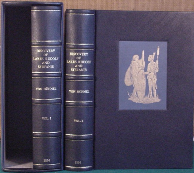 Account of the first Europeans to sight Lakes Turkana (Rudolf)and Chew Bahir (Stefanie), in Northern Kenya and Southern Ethiopia, which region they explored while Count Teleki hunted extensively and von Hoehnel collected botanical specimen. The work has been re-bound in full navy calf with gilt decoration and bands on spine, while original decorative gilt motif from front covers has been laid down on new boards. Both vols are contained in a custom-made slipcase.435 + 397 pp with frontis portrait, sketch map and two sheets of folding maps,numerous engraved plates and text engravings all present. Books are still mostly unslit, but a few pages show signs of rough slitting. Isolated spots of very light foxing, but vol 2 has damp marking penetrating onto bottom margins on some two hundred pages in the middle of the textblock, some rippling of pages. Otherwise this uncommon set is in good condition.